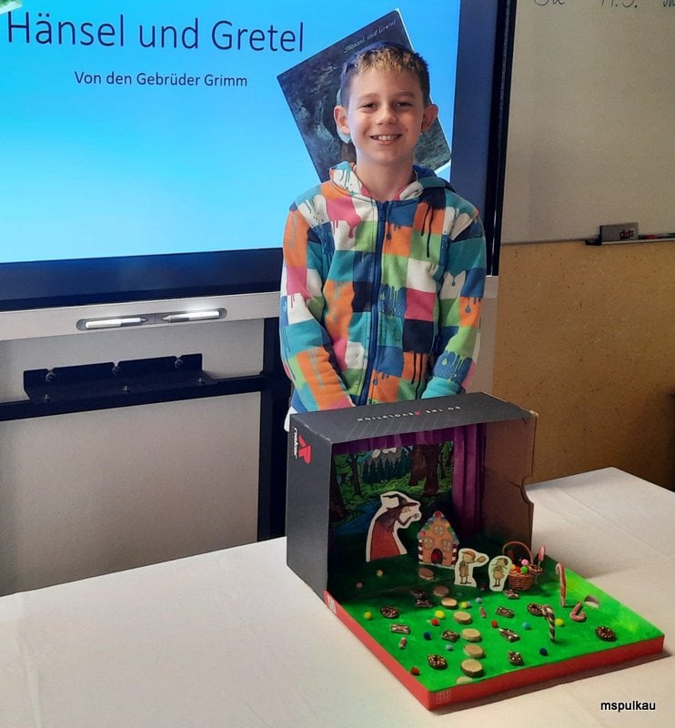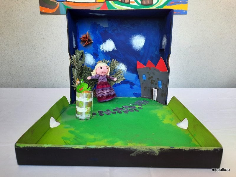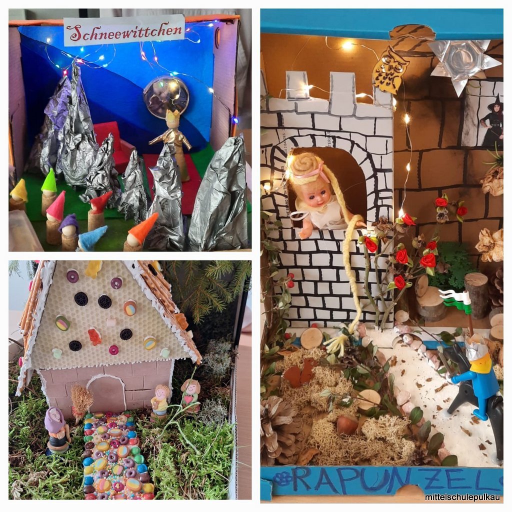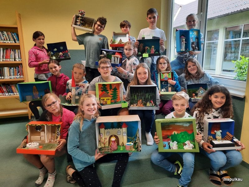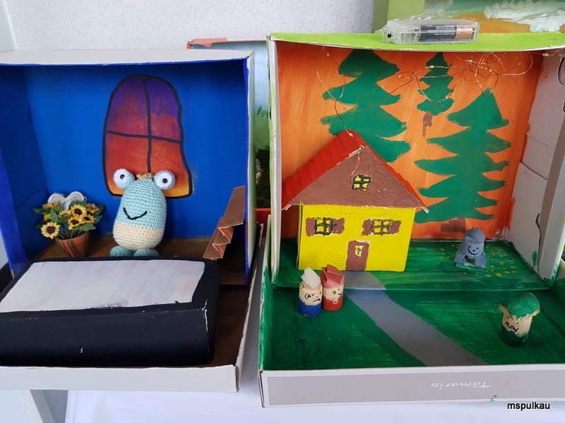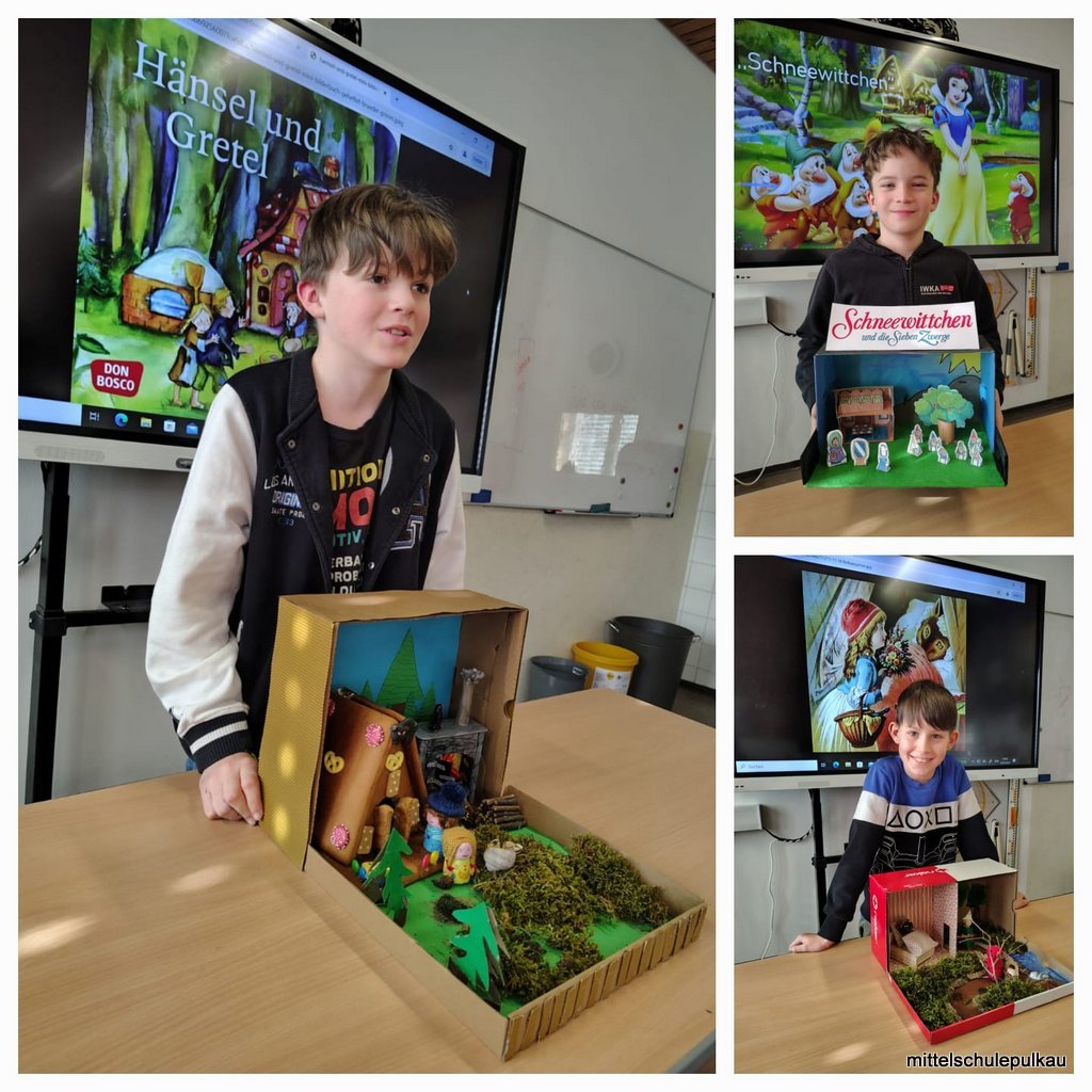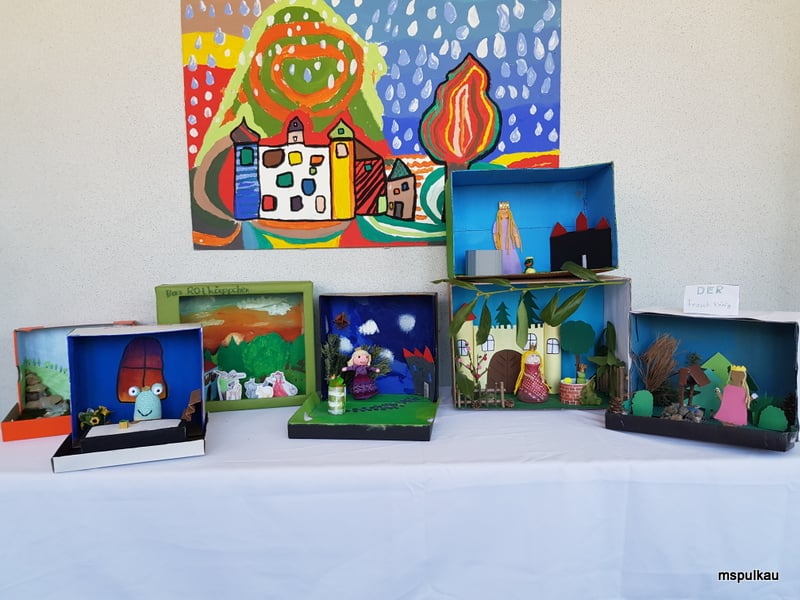 Die erste Klasse gestaltete eine Schuhschachtel passend zu einem Märchen. Jede Schachtel wurde ein kleines Kunstwerk mit vielen unterschiedlichen Details. Das Märchen wurde dann in der Klasse präsentiert. Sehr gut gemacht!