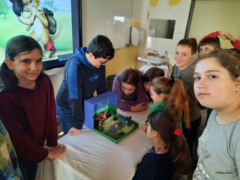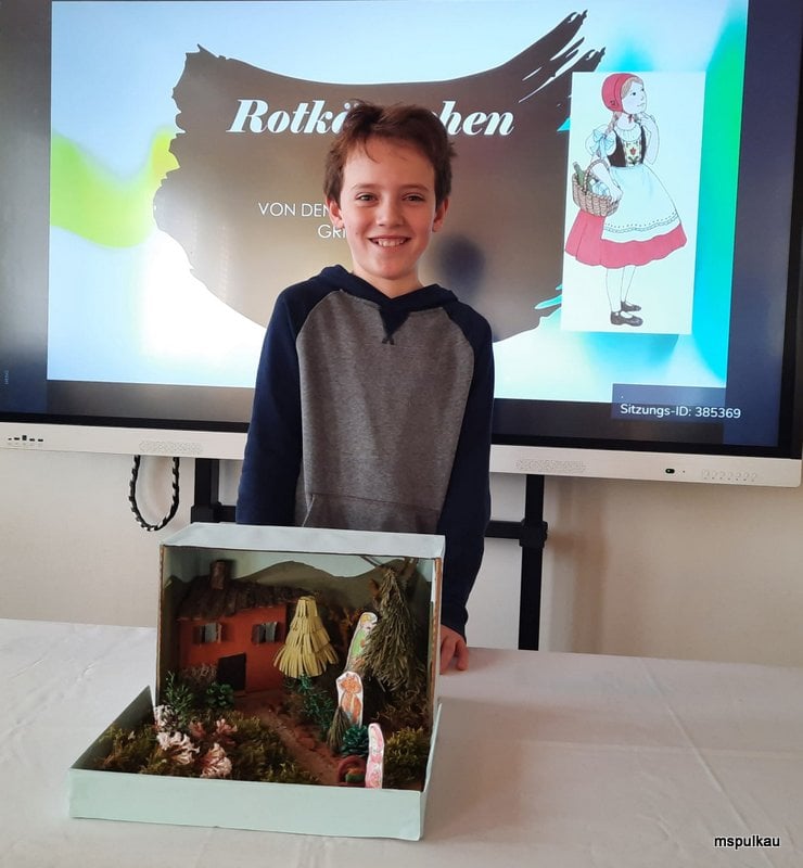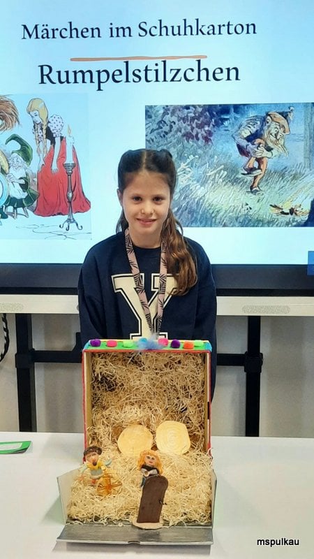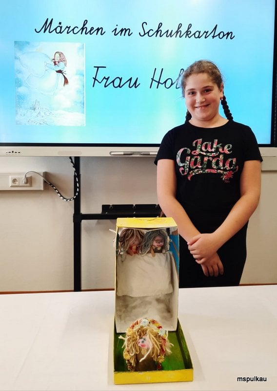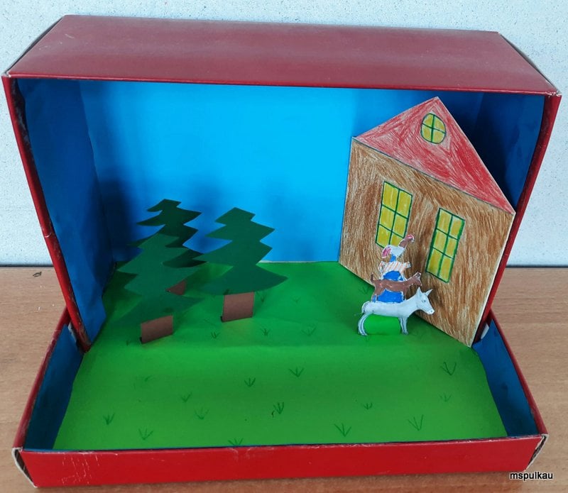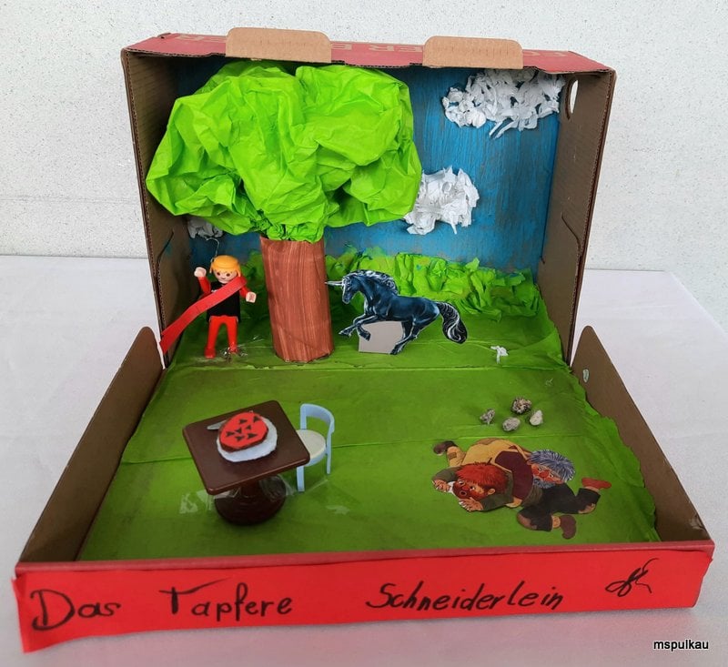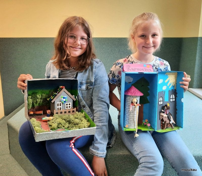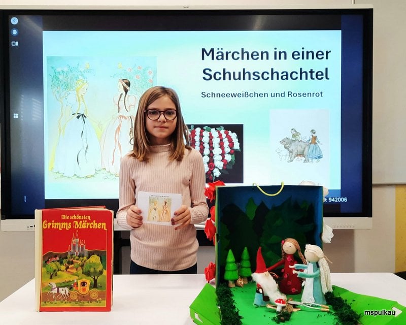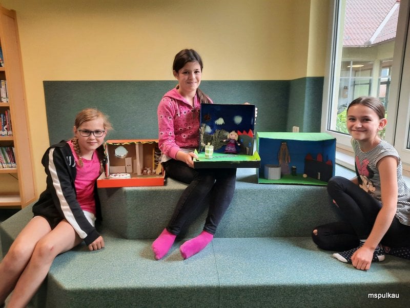 Die erste Klasse gestaltete eine Schuhschachtel passend zu einem Märchen. Jede Schachtel wurde ein kleines Kunstwerk mit vielen unterschiedlichen Details. Das Märchen wurde dann in der Klasse präsentiert. Sehr gut gemacht!