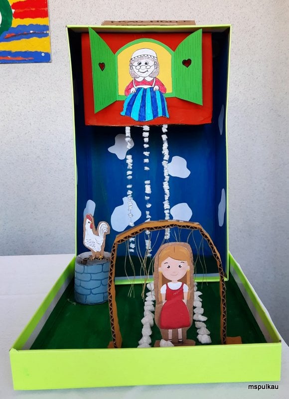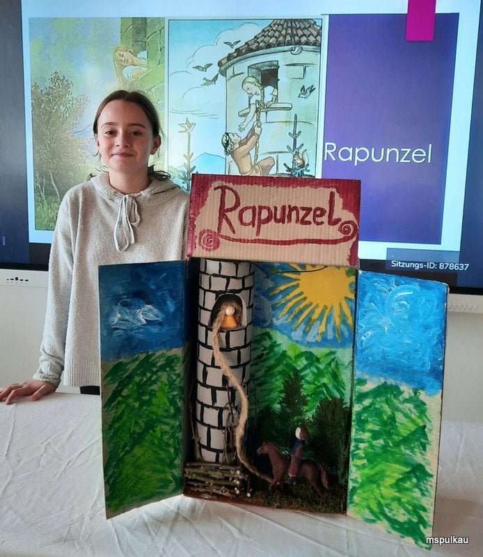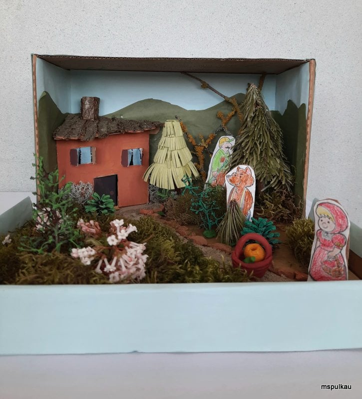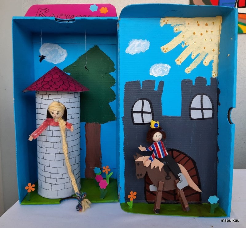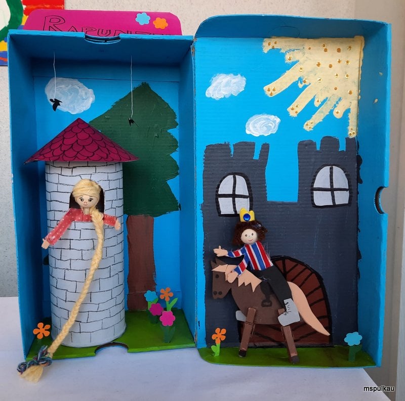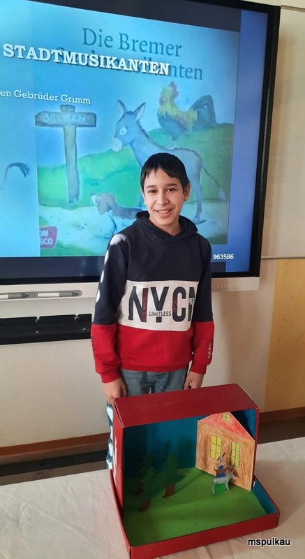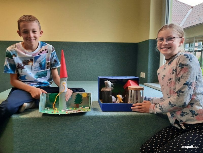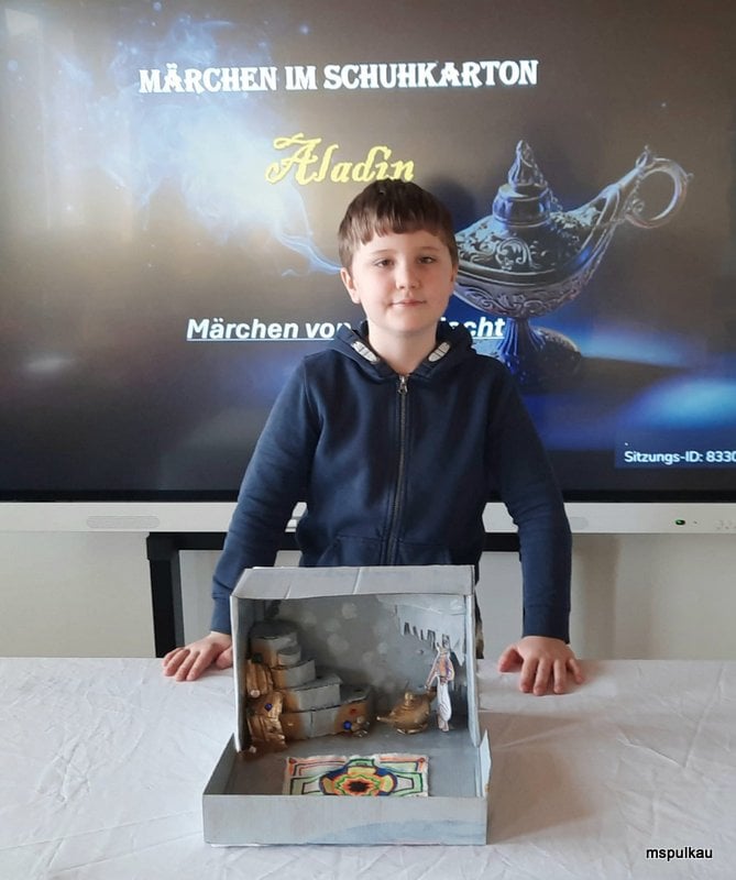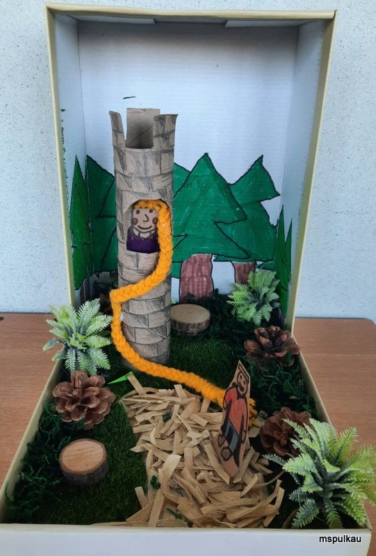 Die erste Klasse gestaltete eine Schuhschachtel passend zu einem Märchen. Jede Schachtel wurde ein kleines Kunstwerk mit vielen unterschiedlichen Details. Das Märchen wurde dann in der Klasse präsentiert. Sehr gut gemacht!
