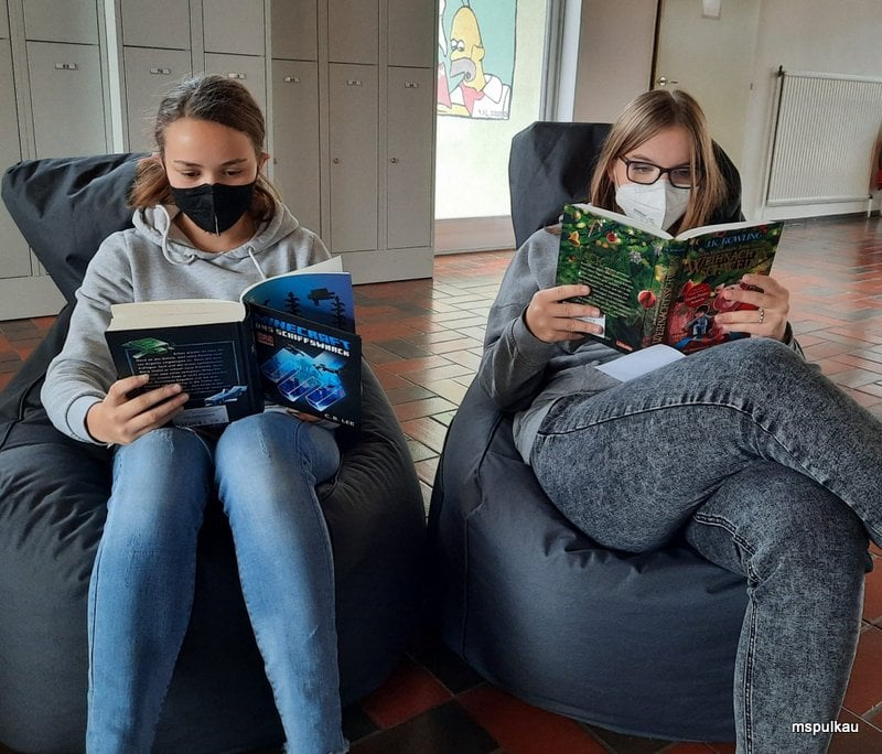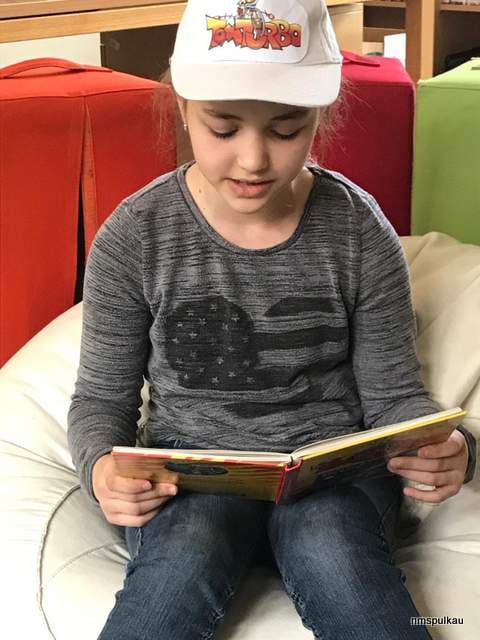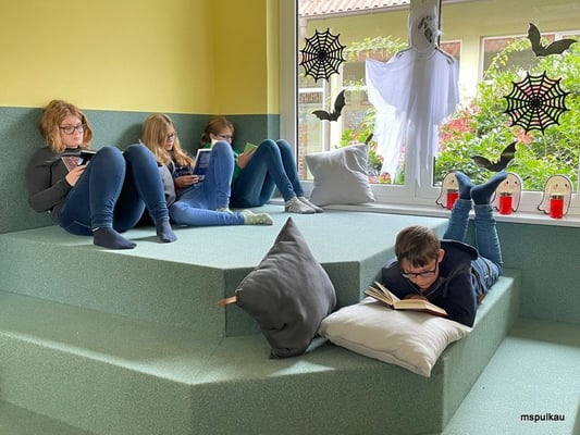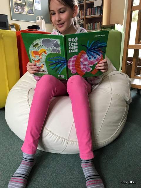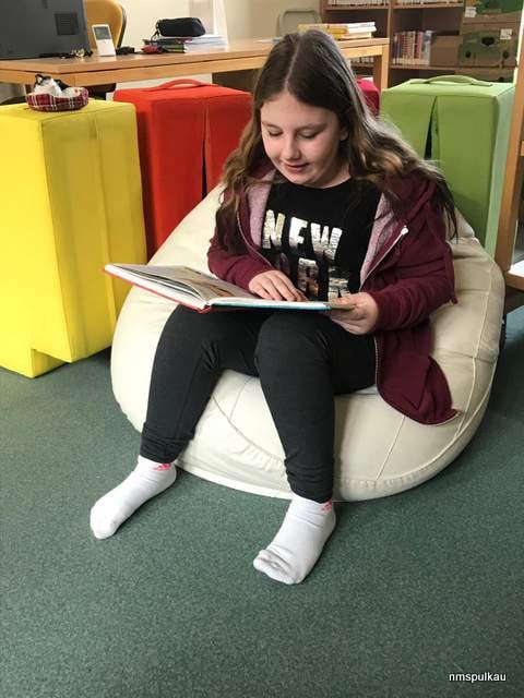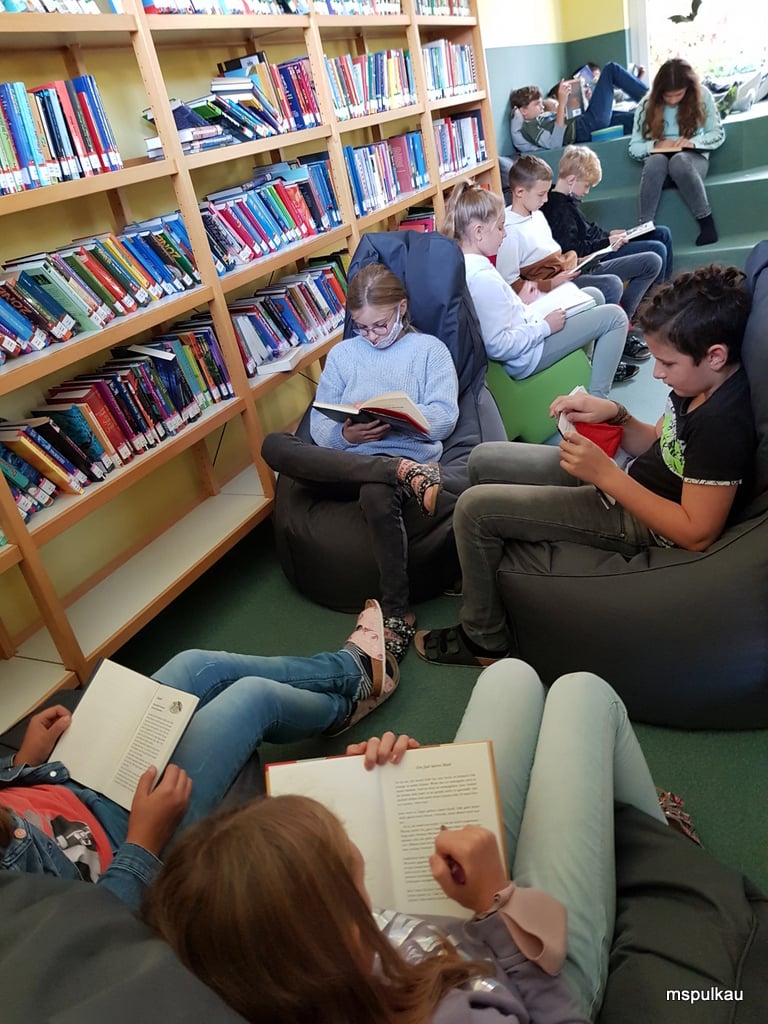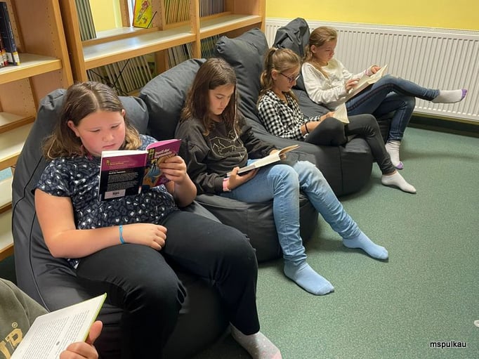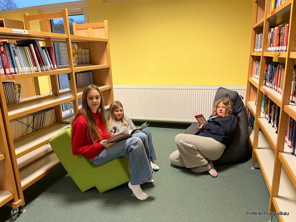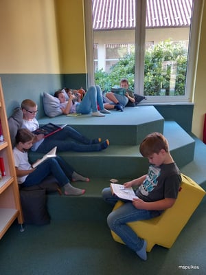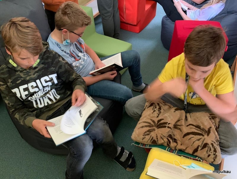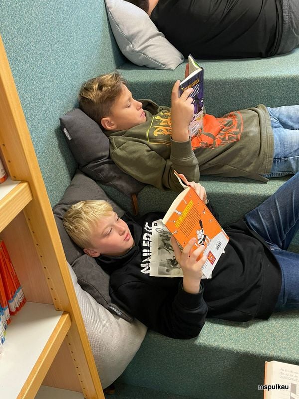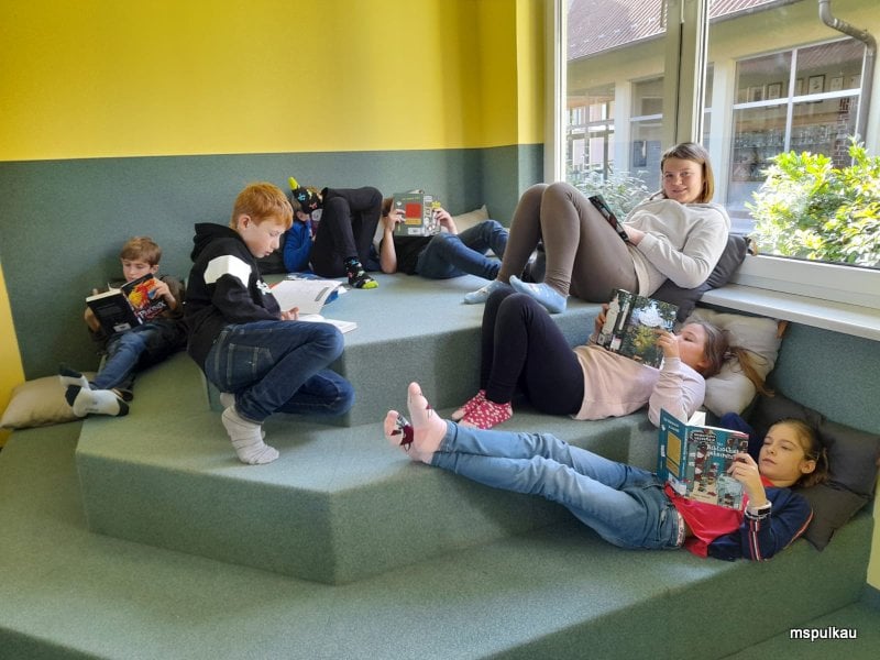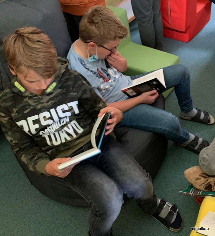 Der Besuch unserer Bibliothek im Rahmen des Unterrichts steht immer wieder auf dem Programm. Diesmal konnte die 1a sich gemütlich mit einem Buch auf den bequemen Sitzpolstern niederlassen und im Buch lesen.