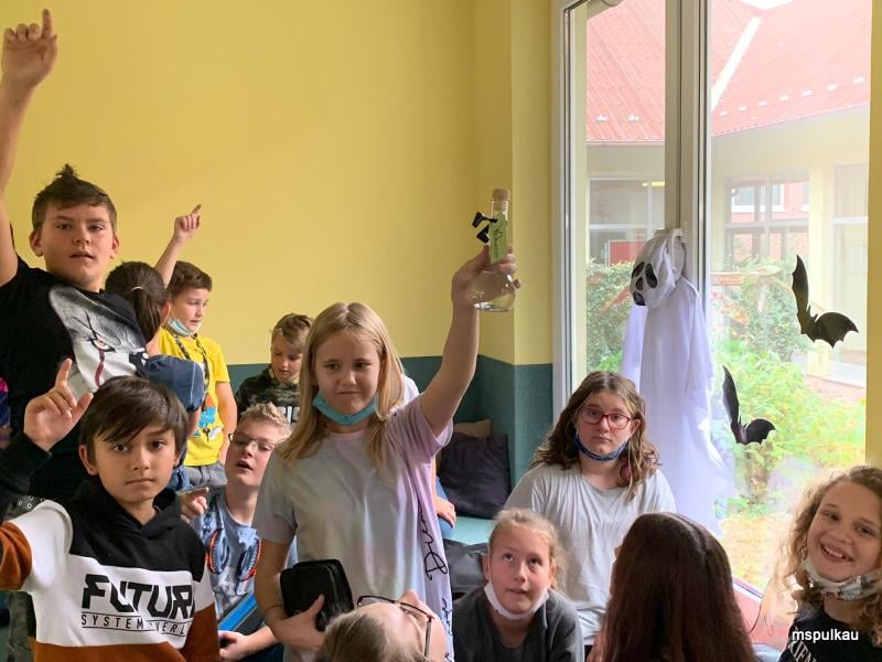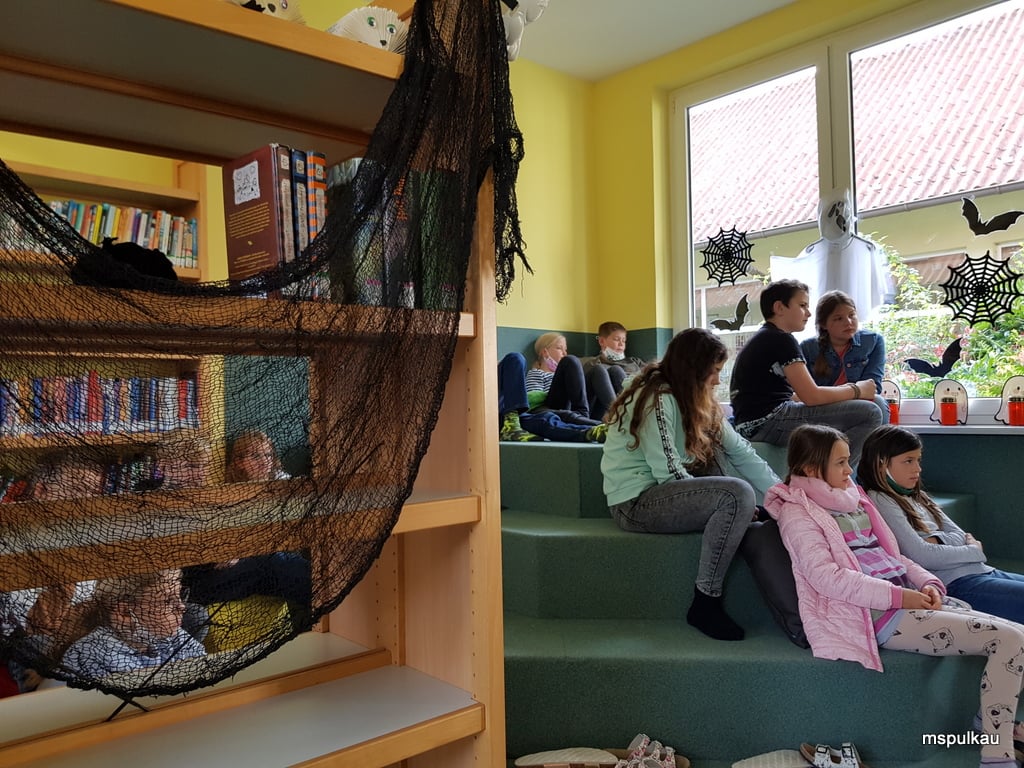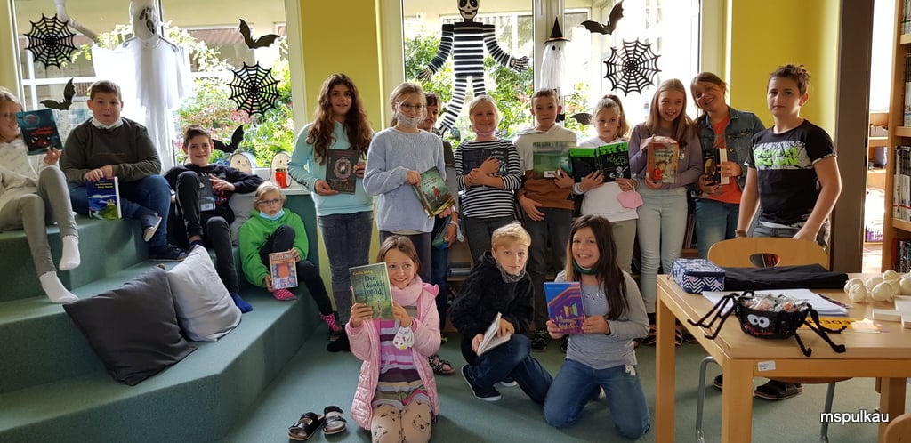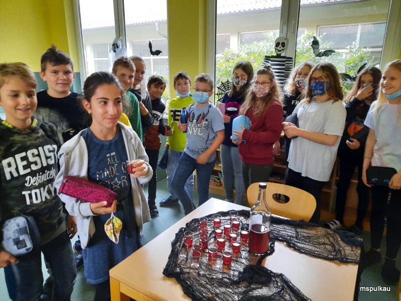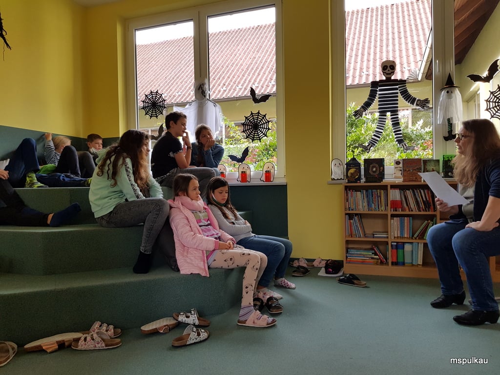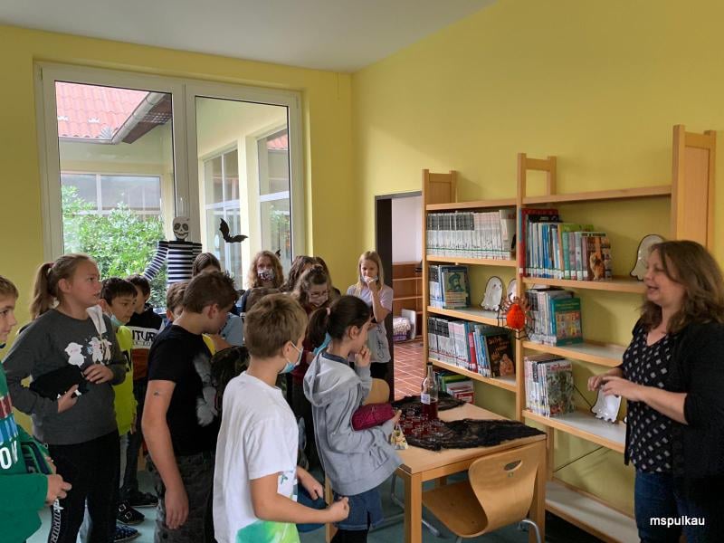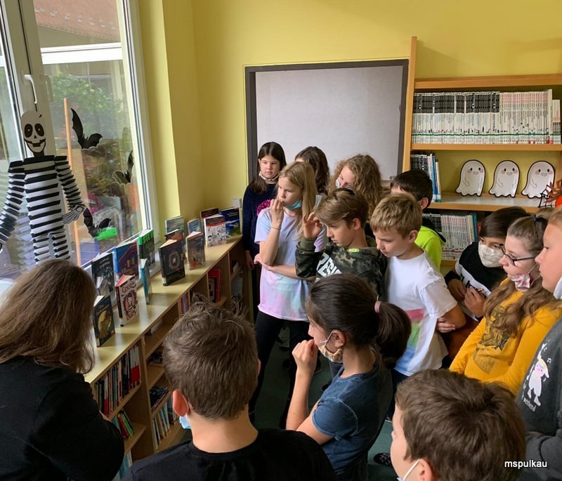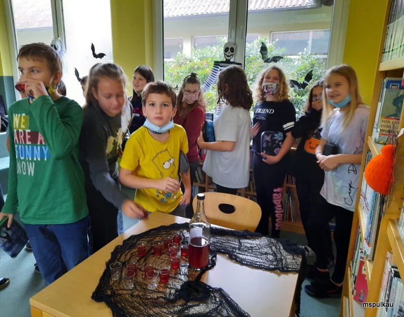 Zwei Deutschstunden der etwas anderen Art durfte die 1. Klasse kurz vor Halloween erleben. Die Bibliothek war zum Fürchten schön dekoriert und Bücher zum Thema standen bereit. Geschichten mit Schockfaktor, verpflichtende Verkostung von Vampirblut, Rätsel und Spiele sorgten für gruselige Stimmung. Zum Schluss schmökerten die Kinder in den Büchern und durften eines mitnehmen. Gespenstischer Lesespaß für die Herbstferien.