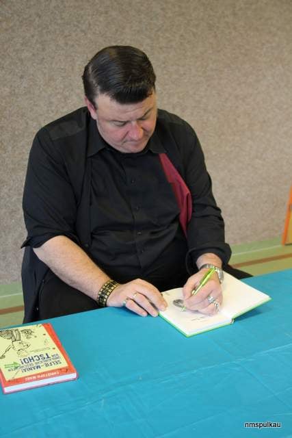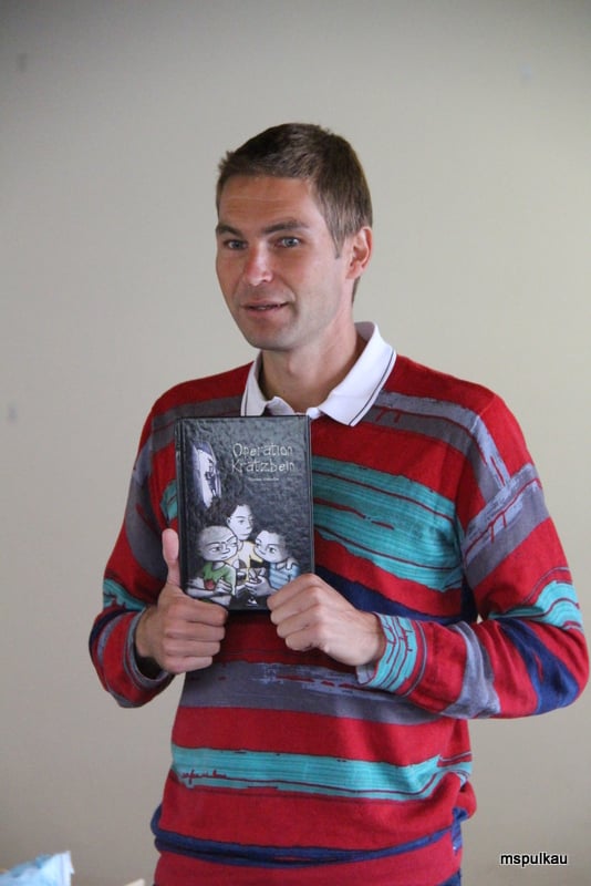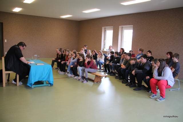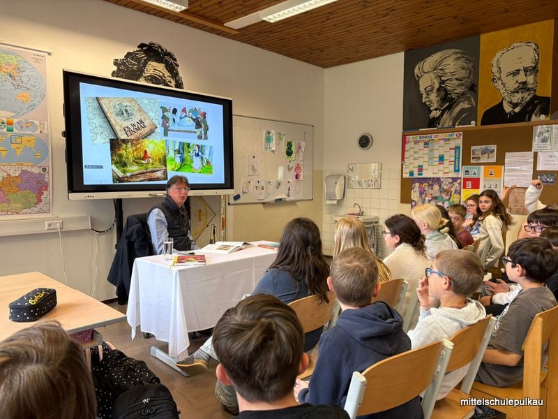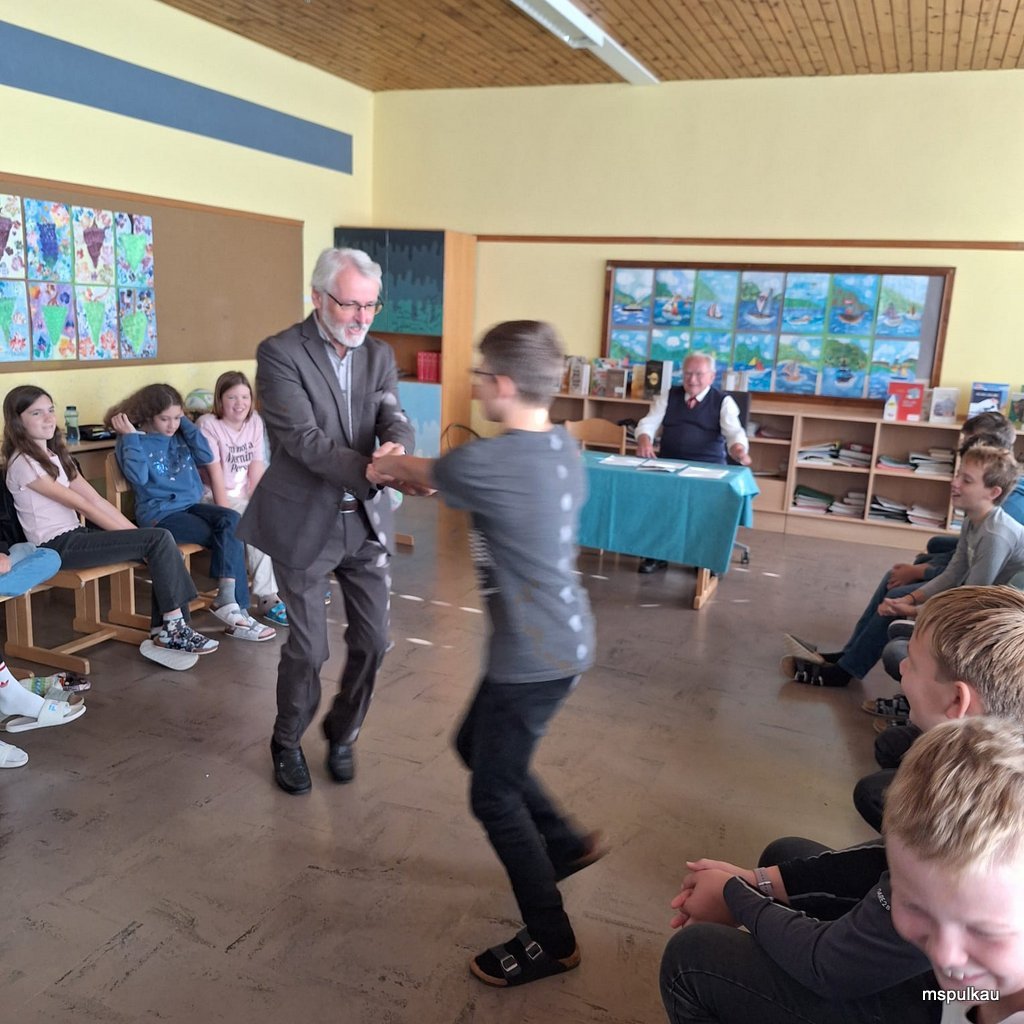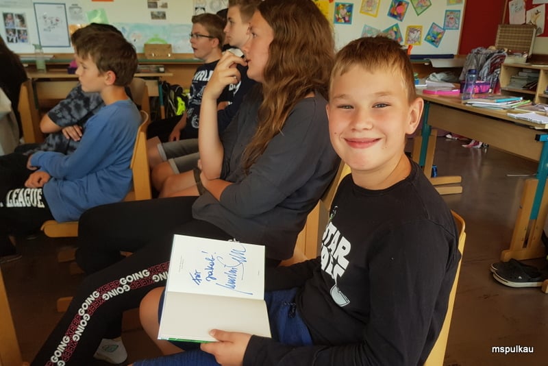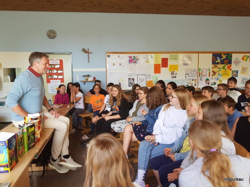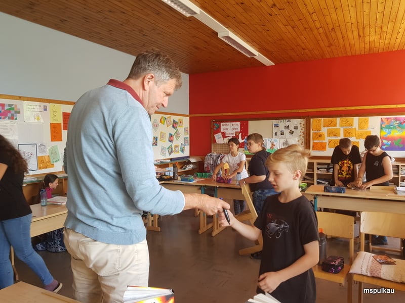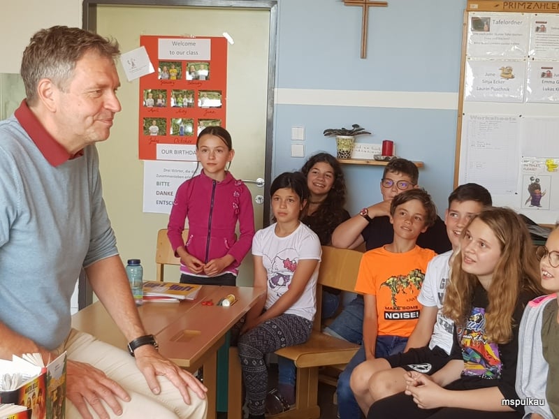 Der bekannte Kinderbuchautor Christoph Mauz las aus seinen Büchern vor und die 1. und 2. Klasse hörte gebannt zu. "Er ist ein Vorleser mit Leib und Seele, mit unglaublich vielen Stimmen und Typen im Gepäck" - so beschreibt er sich auf seiner Homepage. Und wirklich, die Kinder waren begeistert, wie er die Stimmen den Figuren im Buch anpasste. Er erzählte auch, wie ein Buch entsteht und was ein Autor den ganzen Tag macht.