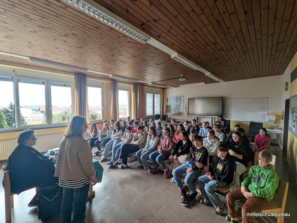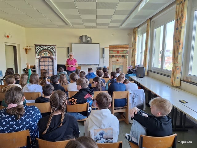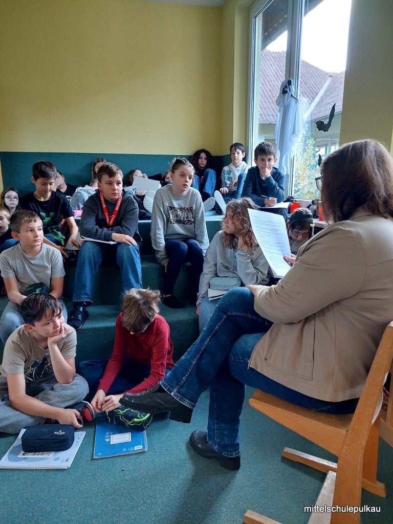 Alle Klassen kamen in den Genuss einer Lesung mit der östereichischen Kinderbuchautorin Karin Ammerer. Den 3. Klassen und der 4. Klasse las sie aus dem Buch "Auf der Flucht" vor und erzählte viele berührende Geschichten, die Frau Ammerer von Asylsuchenden in ihrer Heimatgemeinde erfahren hat. Die Schülerinnen und Schüler hörten interessiert zu.