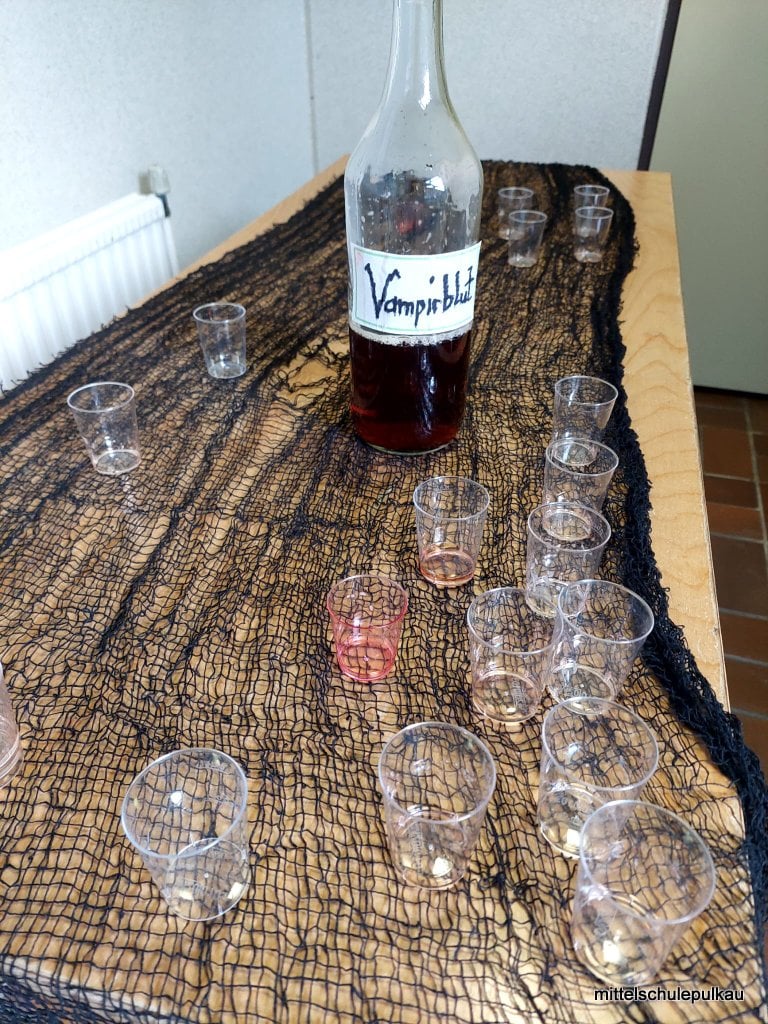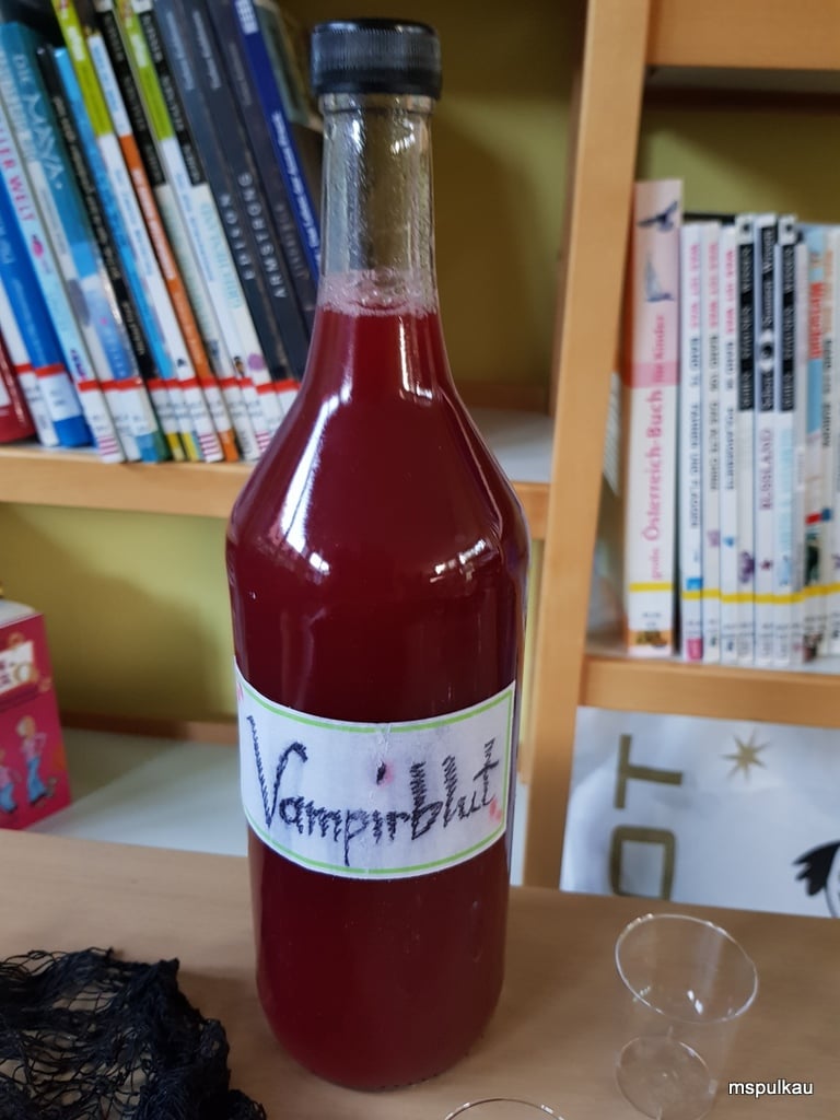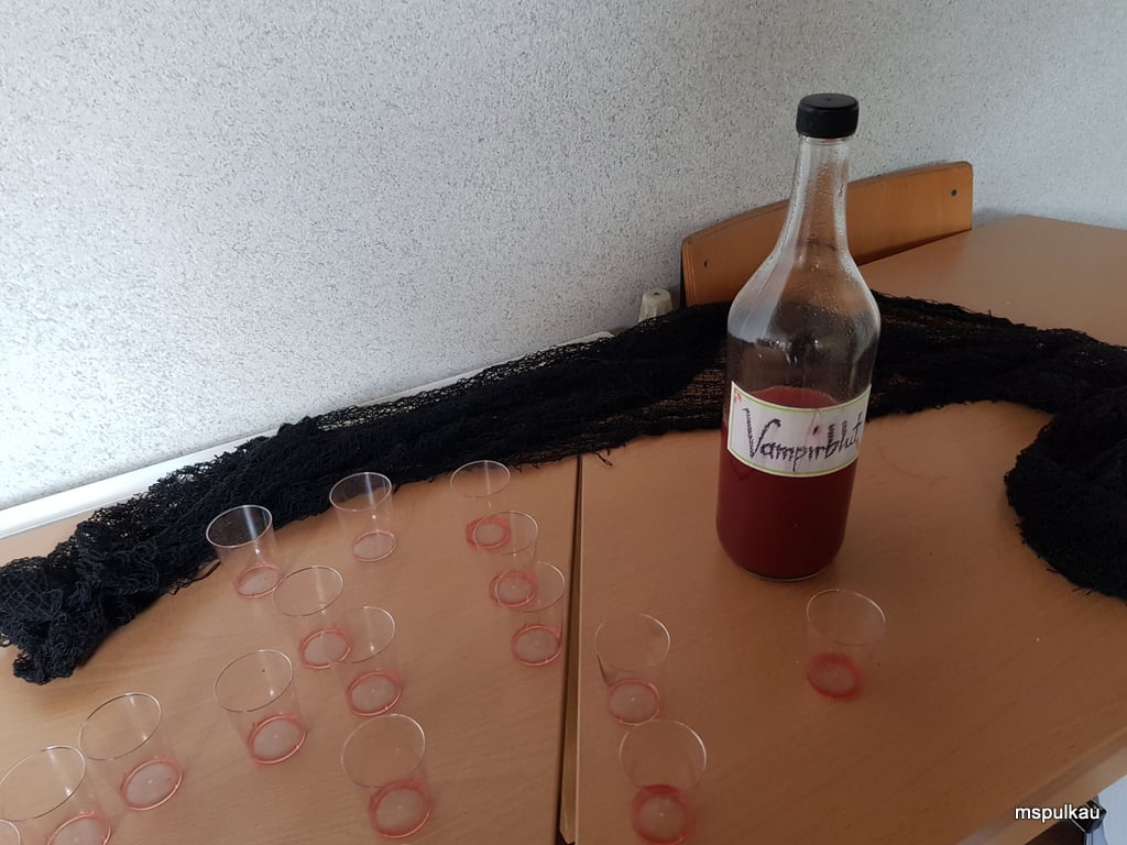 Am Freitag vor den Herbstferien erlebten die Kinder der 1. Klasse eine besondere Deutschstunde, in der sie viel über Vampire erfuhren. Um in die Bibliothek eintreten zu dürfen, mussten die SchülerInnen besonders mutig sein, und Vampirblut trinken. Erst dann konnte man der Gruselgeschichte, die Frau Zechmeister vorlas, zuhören. Anschließend gab es Stationenbetrieb, der die Kinder auch in die Aula führte und als Belohnung am Ende der Stunde Süßigkeiten.