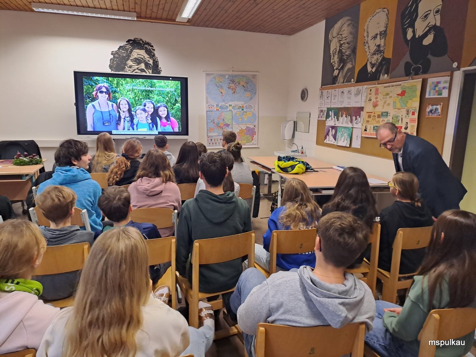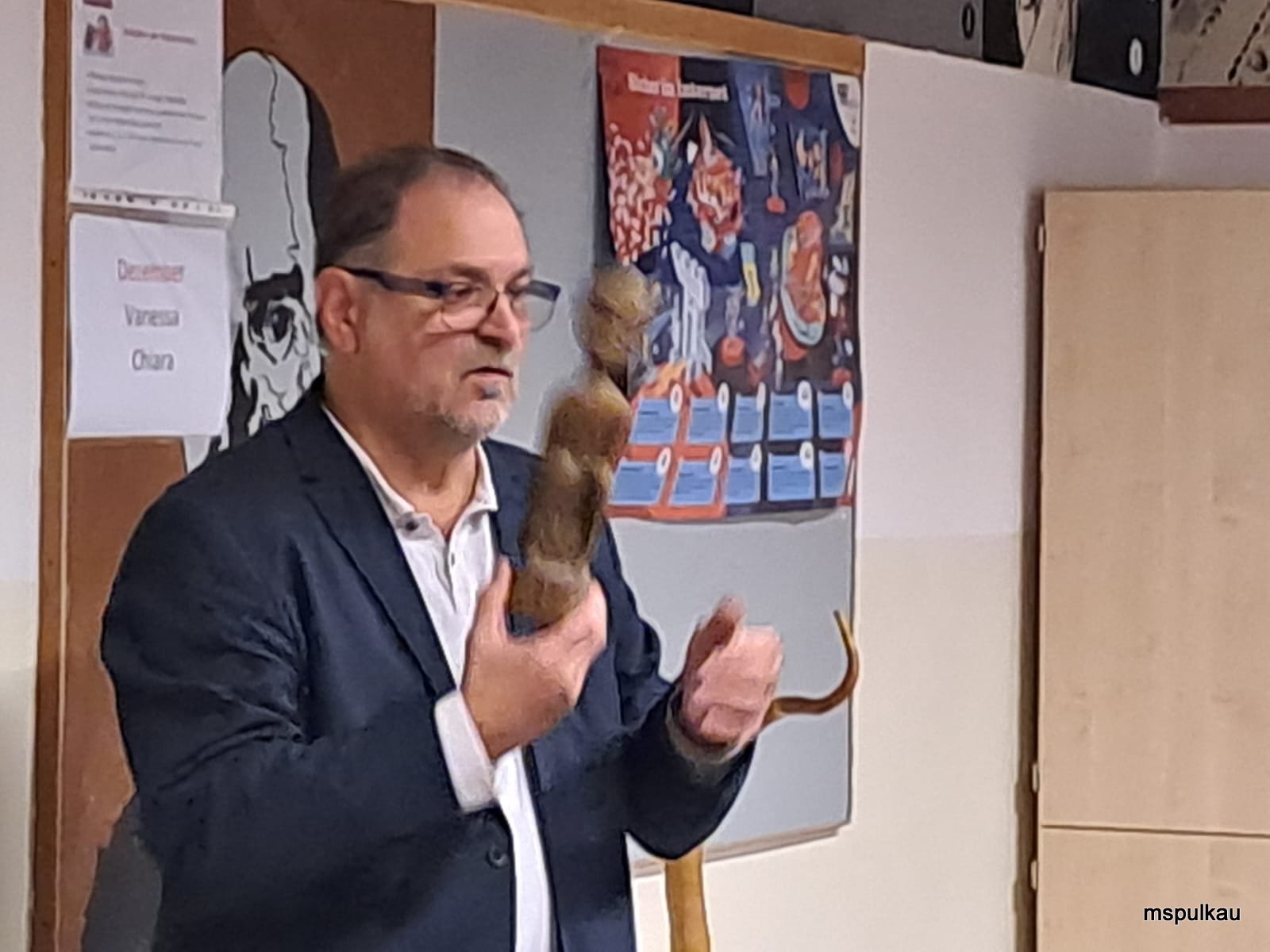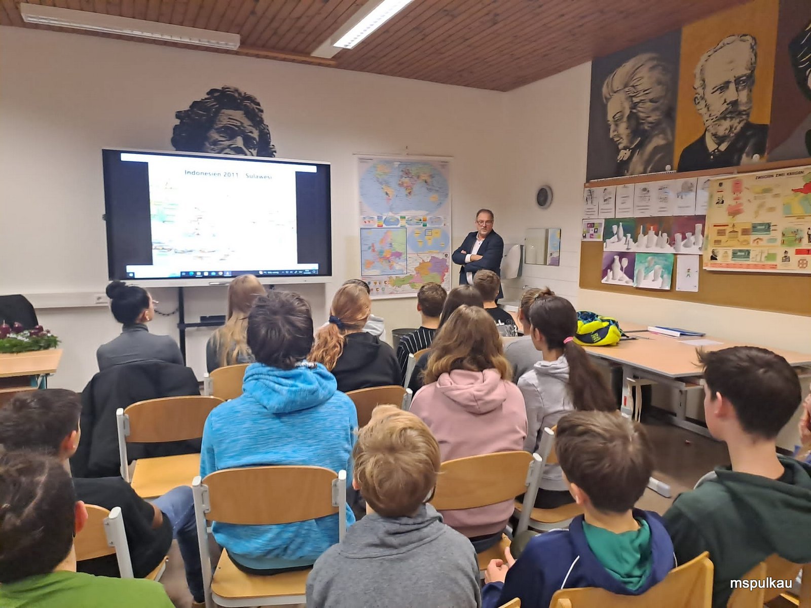 Ein weiterer Lesegast ist unser ehemaliger Kollege Kurt Schneider. Er hat immer Interessantes von seinen Reisen zu berichten und zeigt dazu immer wieder Fotos. Diesmal aus Indonesien, Sulawesi und Westpapua. Die Schüler und Schülerinnen der 3a und 3b hörten aufmerksam zu und hatte im Anschluss noch die Gelegenheit unterschiedliche Objekte aus diesen Ländern zu begutachten.