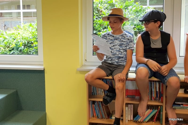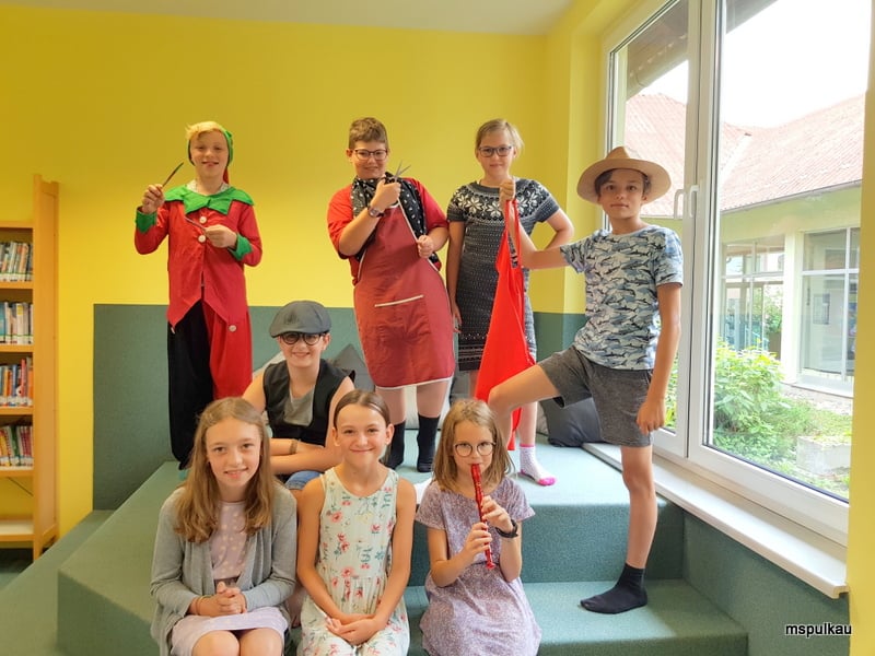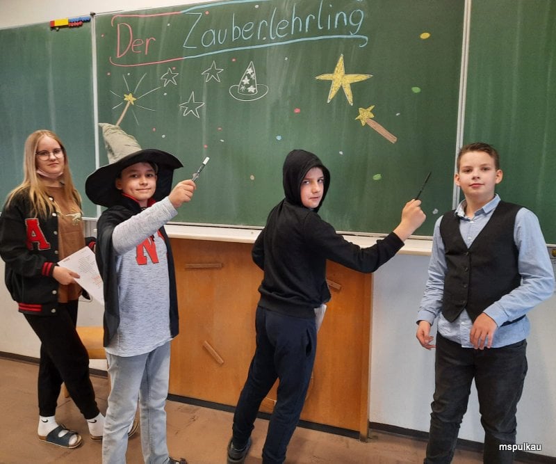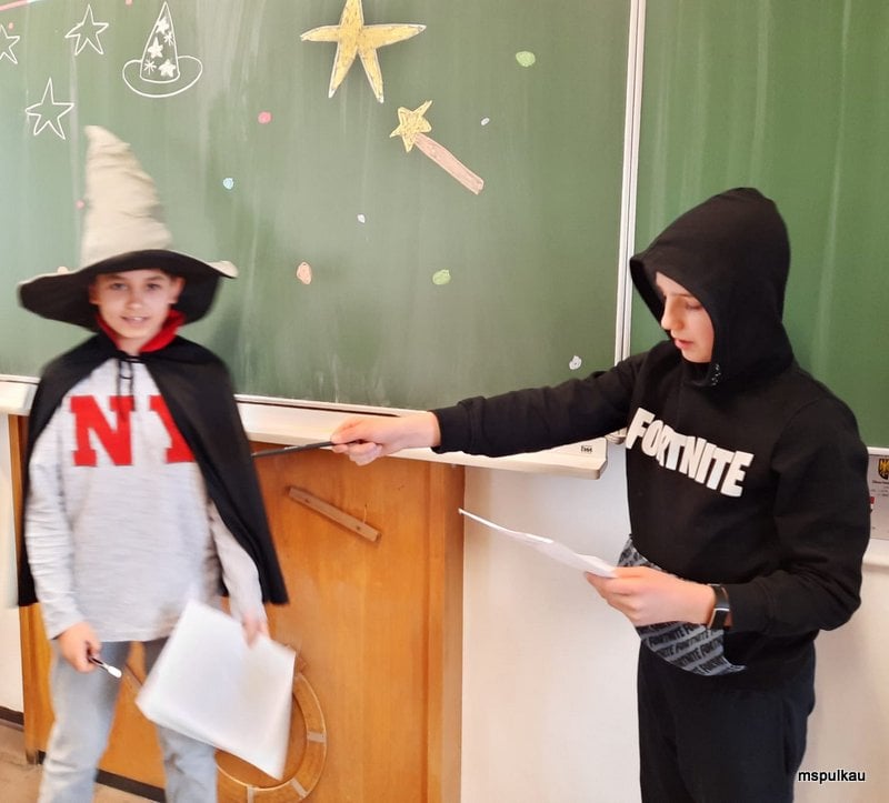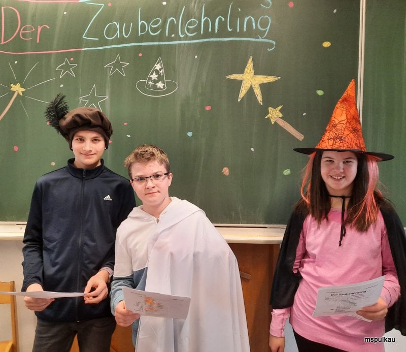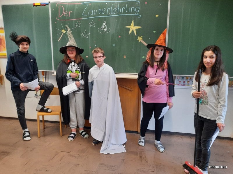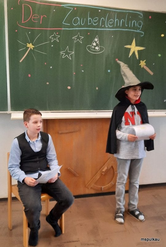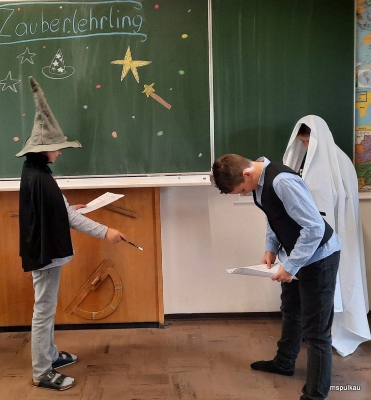 Nun konnte auch die 2. Klasse ein Lesetheater durchspielen. Es wurde die Ballade "Der Zauberlehrling" vorgetragen - und noch mehr Spaß macht es mit Verkleidung. Gut gemacht.