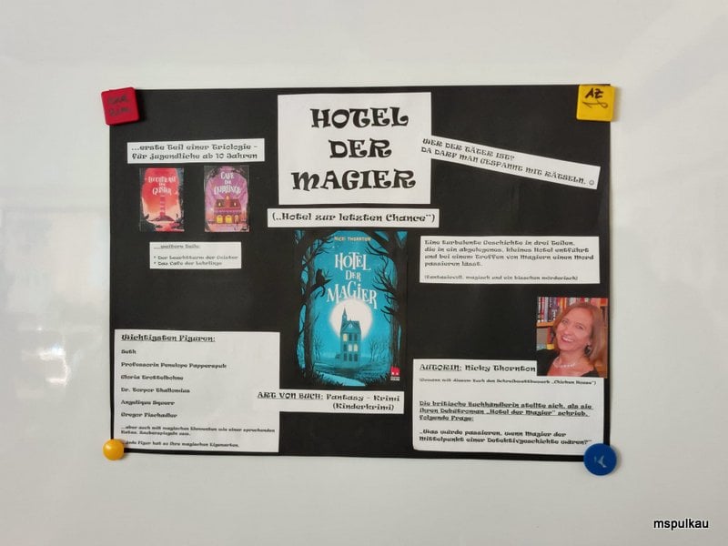 Dazu gibt es eine neue Informationstafel in der Aula mit Fotos von Leseprojekten und die jeweilige Ankündigung für die nächste rotierende Lesestunde. Außerdem werden laufend neue und lesenswerte Bücher vorgestellt.