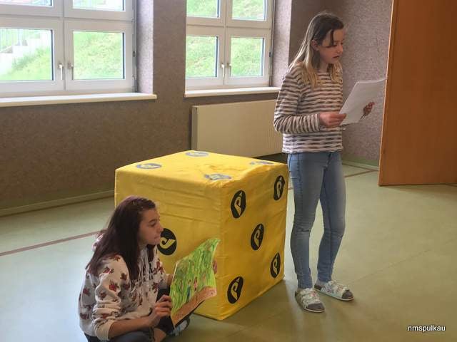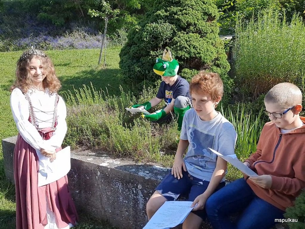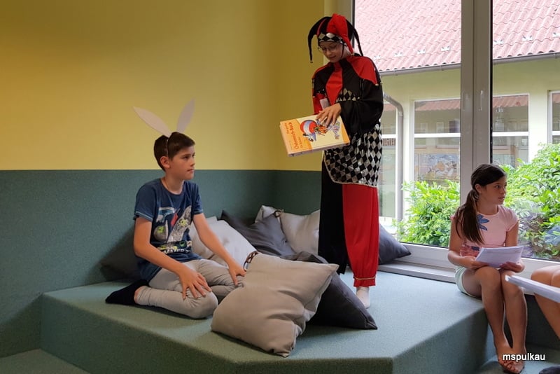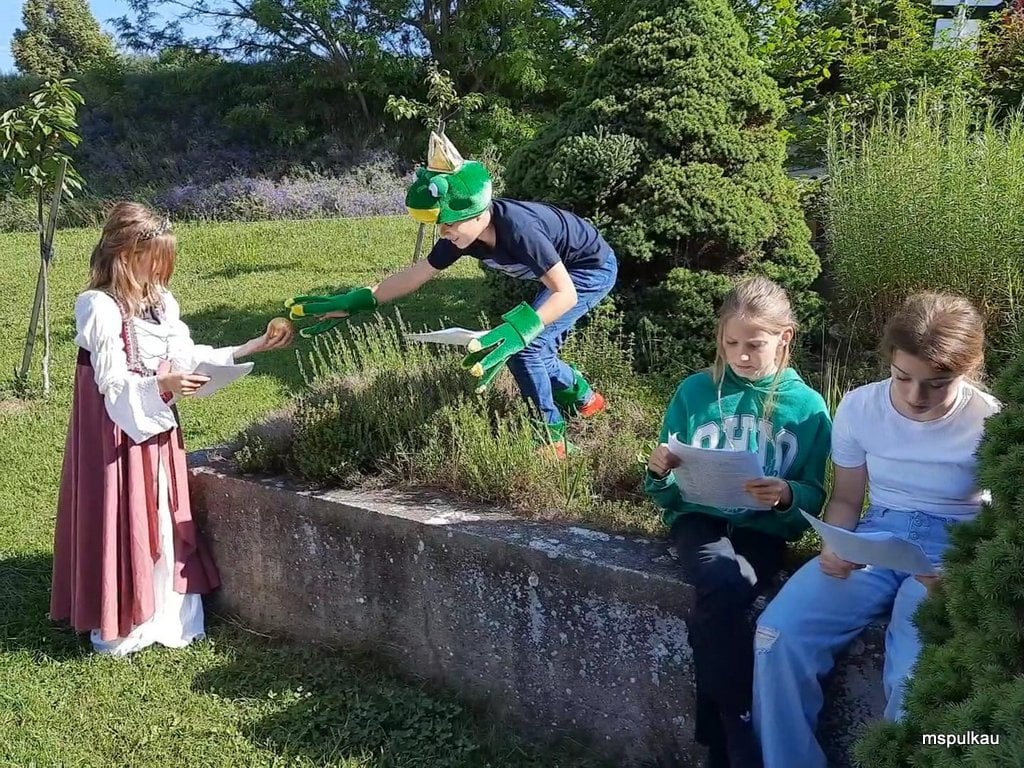Im Sozialen Lernen machten die Kinder der 1a das Schulareal zur Bühne, in zwei Gruppen wurde das Märchen gelesen und gespielt. So macht Lesen Spaß!