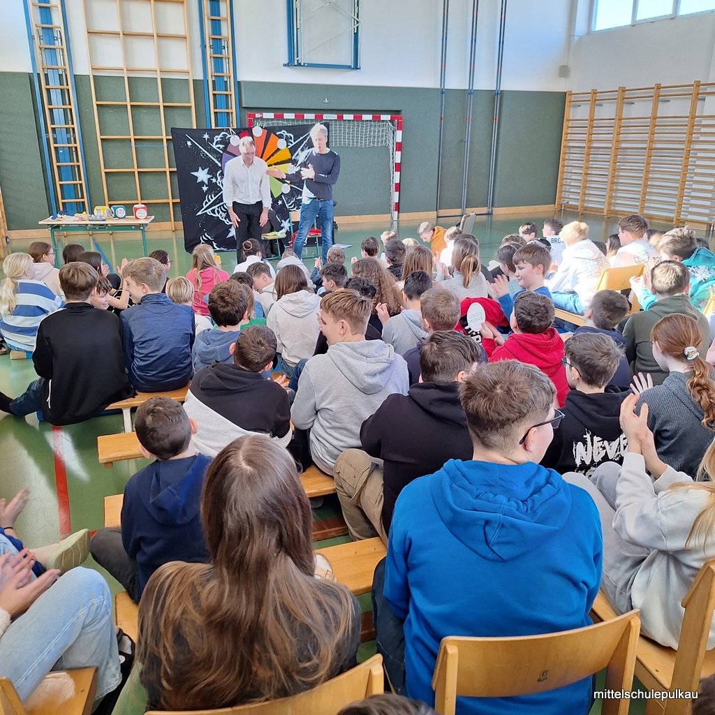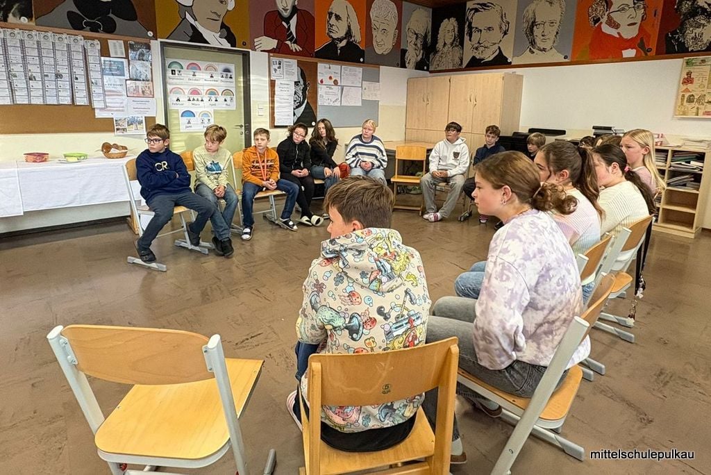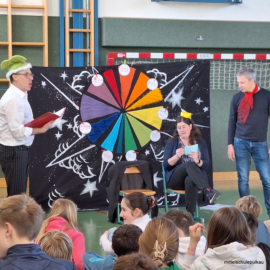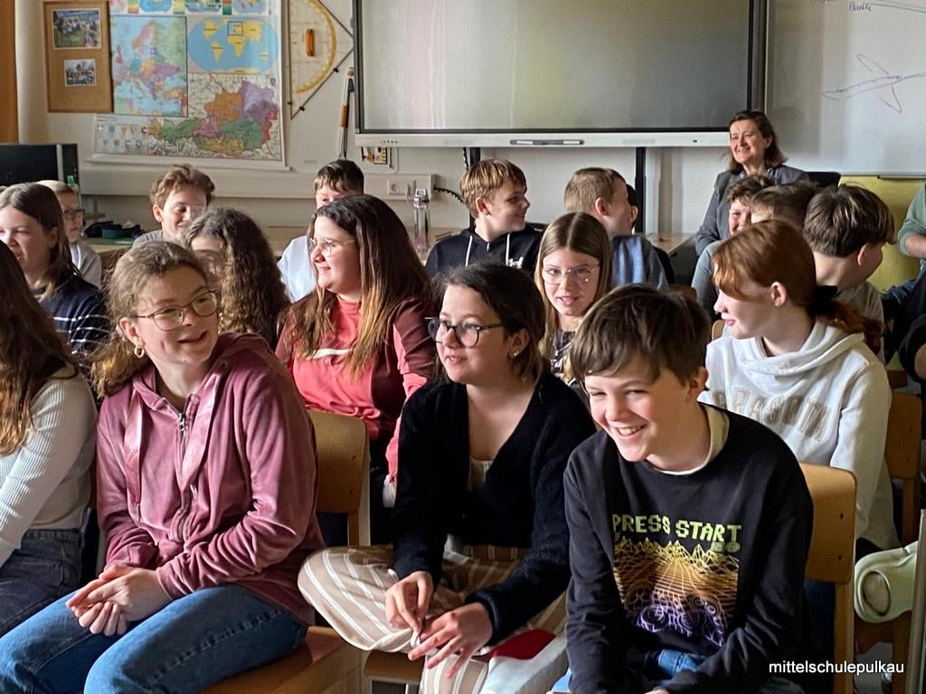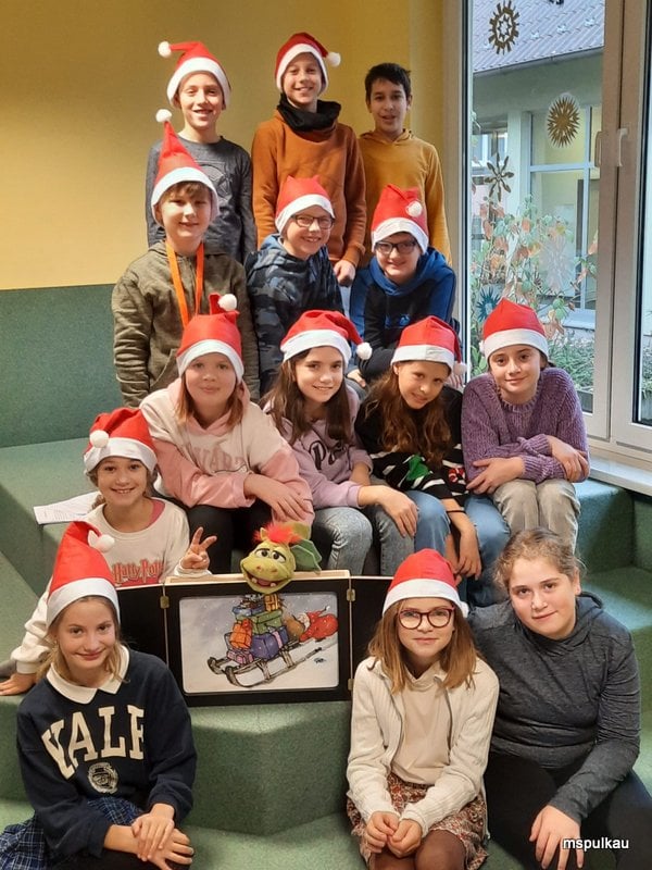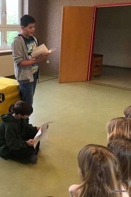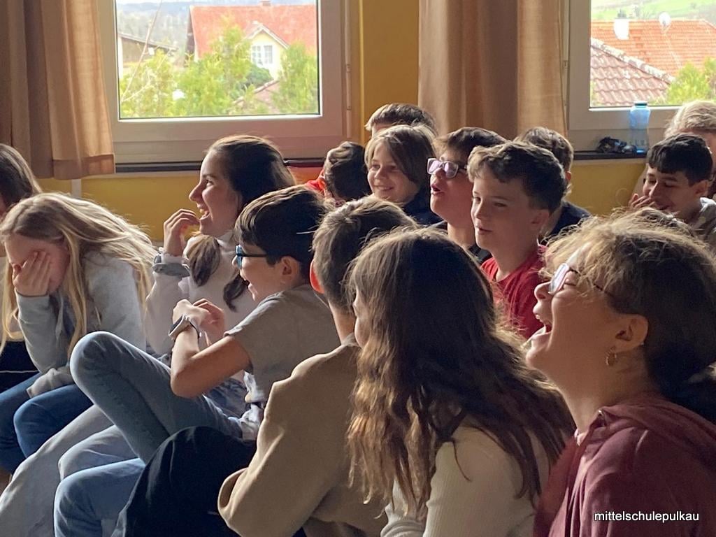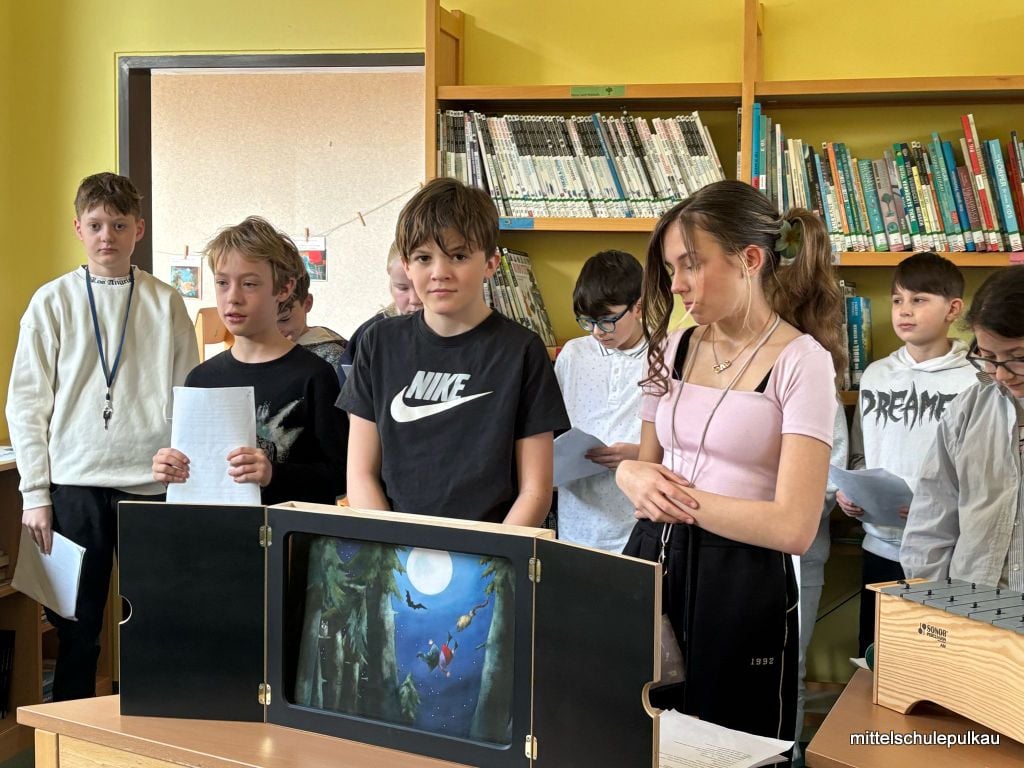 Die Kinder der 1. Klasse Mittelschule luden die Kinder der beiden 1. Klassen VS Pulkau zu einem Lesetheater ein. Es wurde das Bilderbuch "Die Schusselhexe" vorgelesen. Die SchülerInnen bereiteten sich in den Deutschstunden auf den Auftritt vor. Unsere jungen Gäste verfolgten gebannt die Geschichte, die auch mit Musik und anderen Geräuschen unterlegt war.