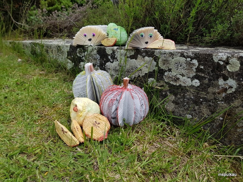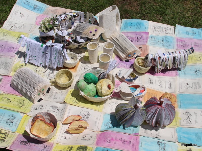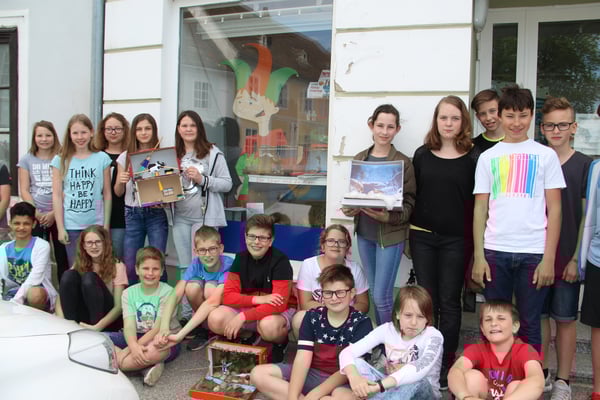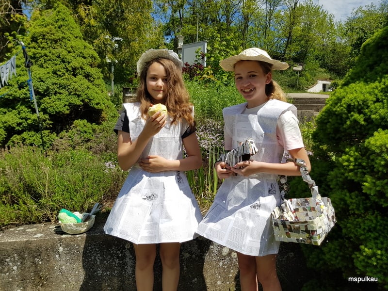 Zeit Punkt Lesen startete einen landesweiten Kreativ-Wettbewerb. Aus alten Büchern sollten originelle Buch.Kunst.Werke entstehen. Frau Zechmeister, unsere Verantwortliche für die Bibliothek, hatte einige Ideen. Diese wurden im Werkunterricht mit den Kindern der 3. Klasse und der Werklehrerin Frau Jagenteufel sehr originell und kreativ umgesetzt. Man bastelte und nähte zum gewählten Thema "Bücher zum Fressen gern haben". Das Endergebnis waren eine Picknickdecke bestückt mit Geschirr, Obst und Gemüse und Sardinendosen. An der Picknickdecke schnupperten zwei süße Hunde und einige Bücherigel. Unsere zwei Models trugen Kleidungsstücke, ebenfalls aus Buchseiten. Ein wirklich gelungenes Gesamtprojekt.