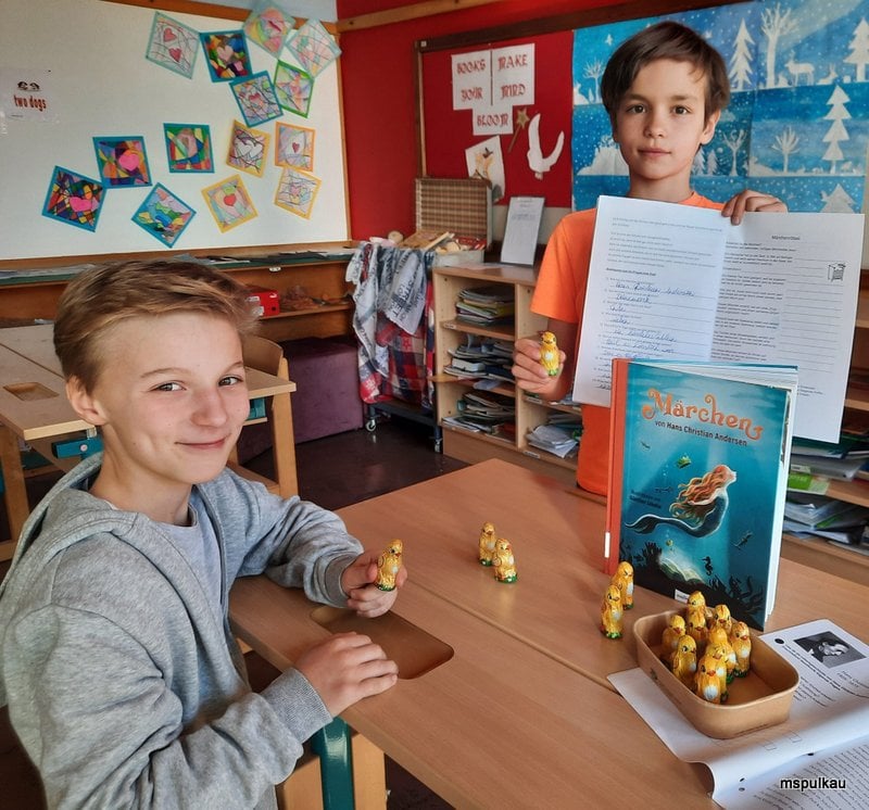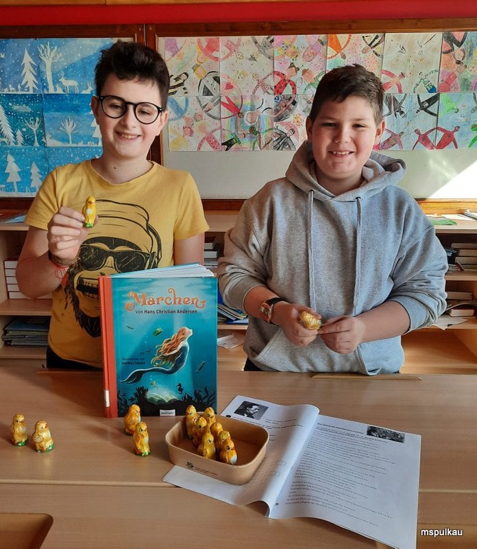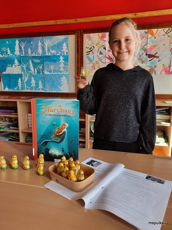 Für die Kinder der 1. Klasse gab es im Rahmen des Deutschunterrichts einen Stationenbetrieb mit dem Thema "Der Märchendichter Hans Christian Andersen". An unterschiedlichen Stationen konnten die Schülerinnen und Schüler Interessantes erfahren. Sie waren mit Eifer dabei - und am Ende gab es ein kleines Schokoküken zum Naschen. So schmeckt Unterricht.
