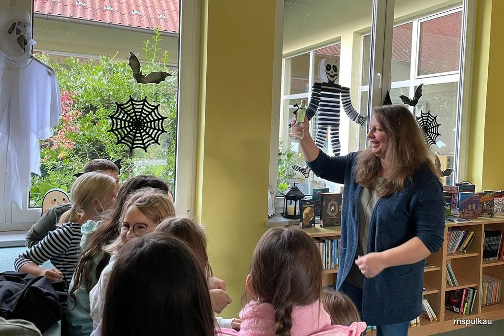 Die erste Klasse konnte zwei spannende Stunden mit der Bibliotheksleiterin Frau Zechmeister verbringen. Der Raum war passend zum Thema "Vampire" geschmückt. Als "Eintrittsticket" musste Vampirblut getrunken werden. Danach hörten die Kinder verschiedene Fakten über Vampire. Mit einem "Spinnennetzspiel" in der Aula wurde gleich das Gelernte wiederholt und im Schulgebäude waren verschiedene "Gruselwörter" zu finden. Eine "Gruselgeschichte" rundete die Aktion ab. Die Kinder suchten sich geeignete Bücher zu diesem Thema aus und schmökerten bis zum Läuten.