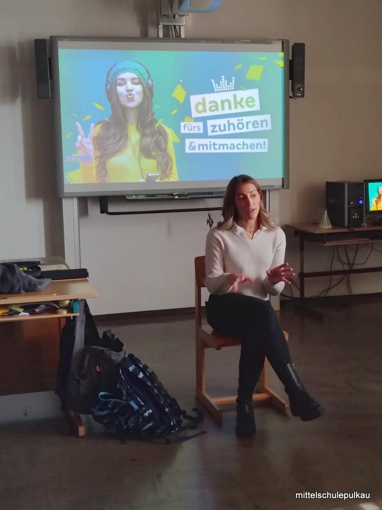 Juliana "Julie" Frey arbeitet als Moderatroin und Reporterin für Kronehit. Außerdem singt und spielt sie in der Band "Time LApse". Frau Frey las die Kurzgeschichte "Ein Tag ohne Handy" vor und berichtete über ihre Arbeit bei Kronehit. Sie beantwortete gerne die Fragen der Schülerinnen und Schüler. Danke für den Besuch, es hat uns sehr gefreut, dass du deine "alte" Schule besucht hast. Witerhin viel Erfolg.