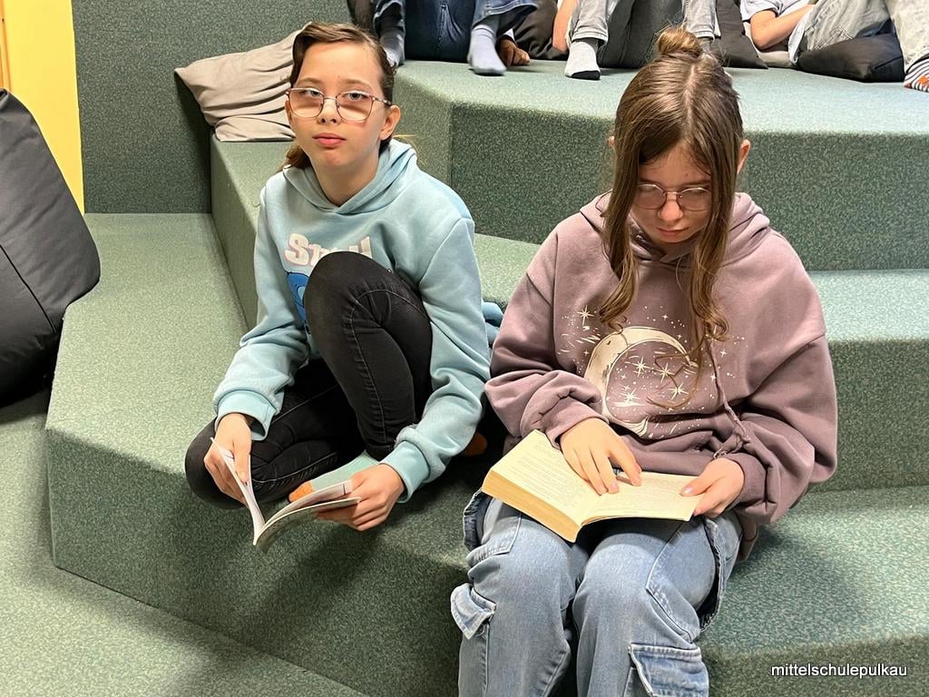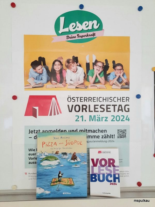 Ganz Österreich liest, auch in der MS Pulkau stand das Vorlesen an diesem Tag im Mittelpunkt. Kinder aus der 4. Klasse lasen in der Schulbibliothek schräge, lustige und philosophische Geschichten zum Thema Essen aus dem Buch " Pizza vom Südpol" von Jens Rassmus vor. Ein gelungener Vorlesespaß für die ganze Schule.