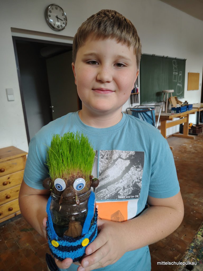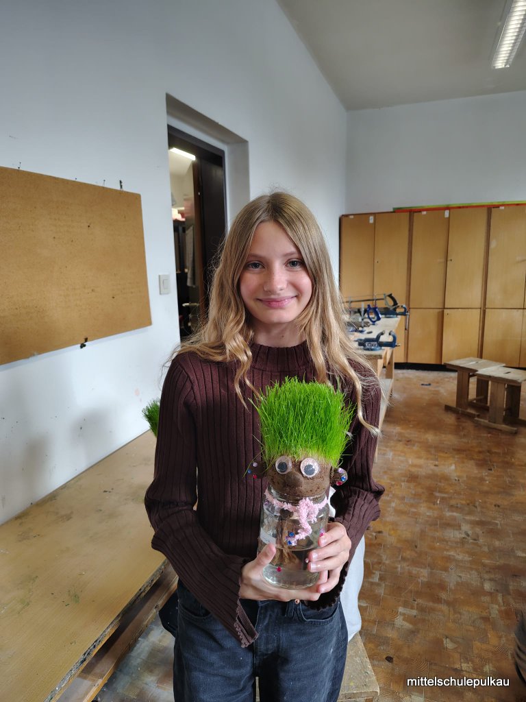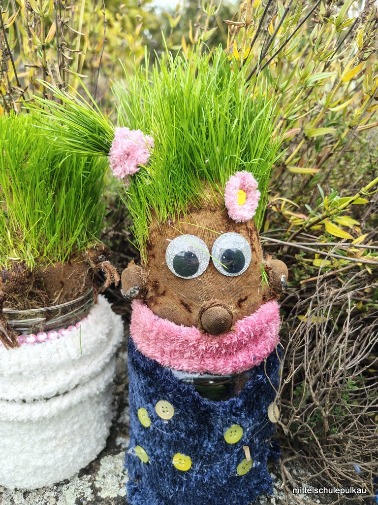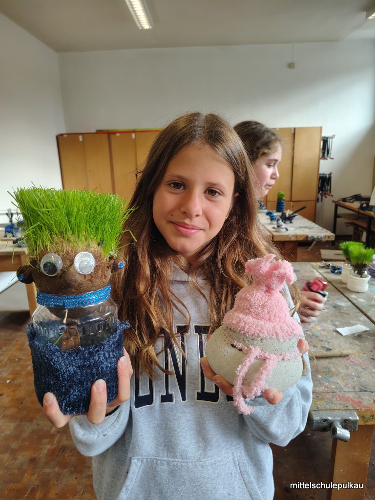 Im KREATIV-Workshop mit Frau Heller wurden lustige Grasköpfe hergestellt. Die Strumpfhose wurde mit Erde und Grassamen gefüllt und in einen Glasbehälter gestellt, bis das Gras zu wachsen begann. Zuletzt bekamen die Köpfe noch Augen und Mund und die unterschiedlichsten Frisuren wuchsen aus den Köpfen. Auch die Schneemänner erhielten ein Gesicht und Hauben und können nun als Deko für daheim verwendet werden.