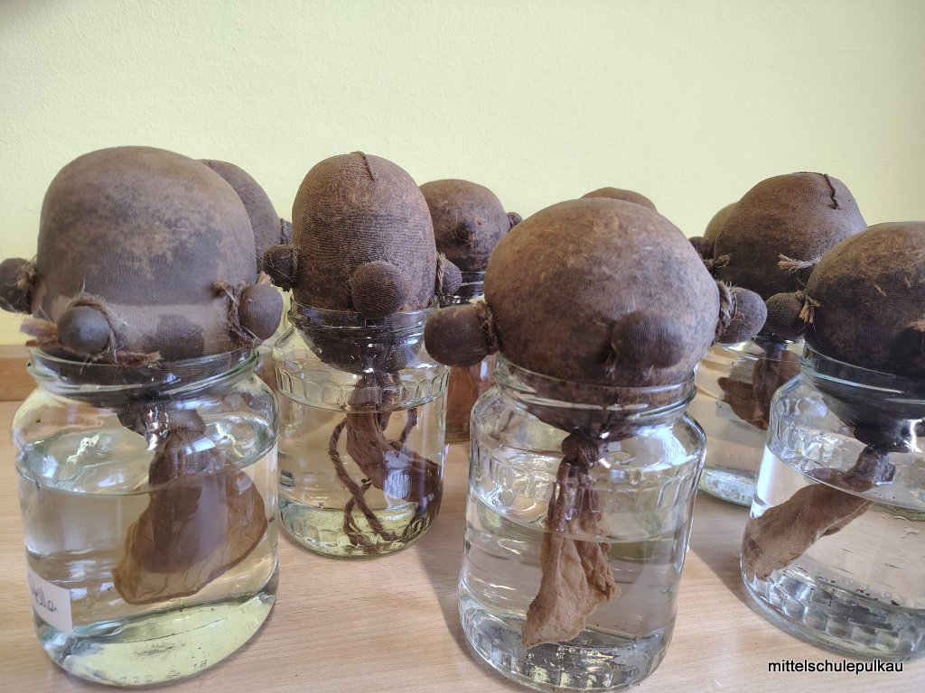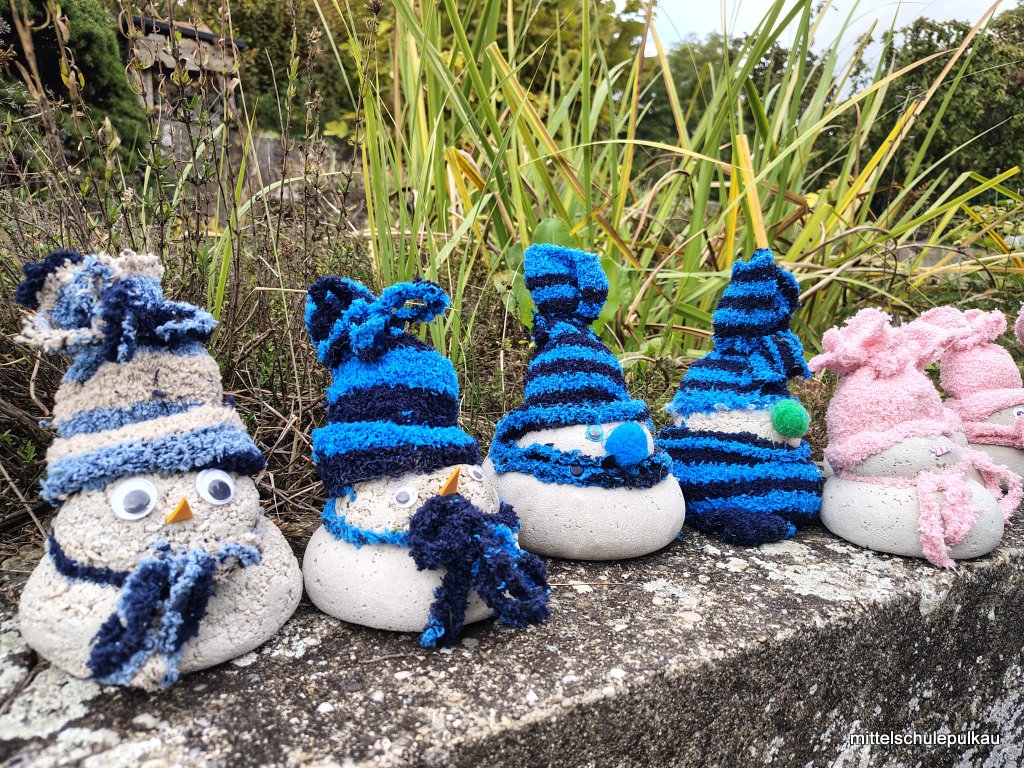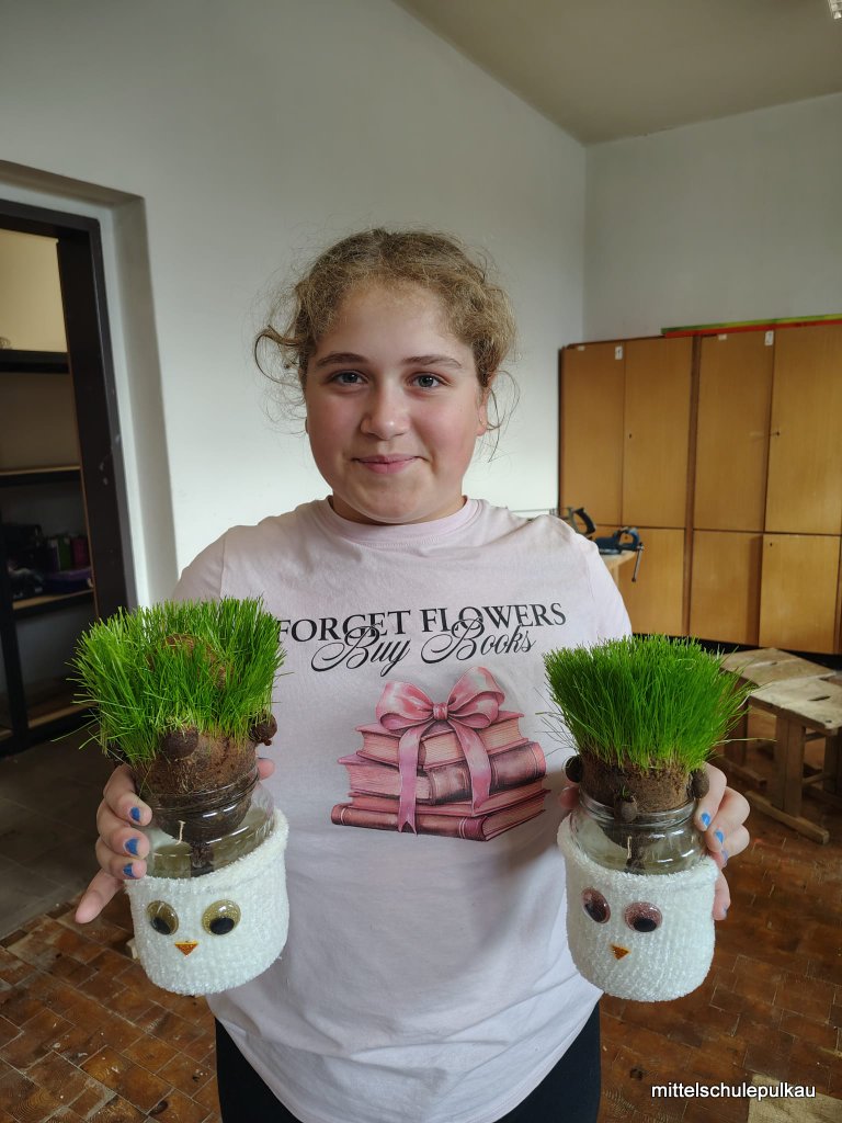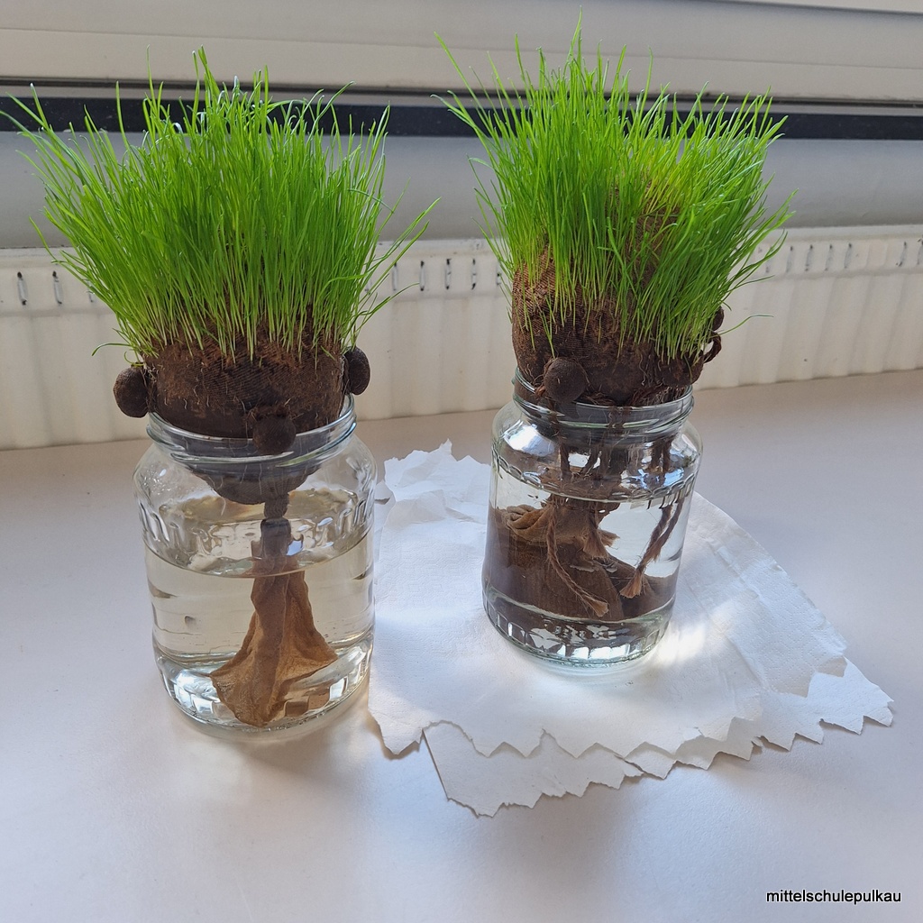 Im KREATIV-Workshop mit Frau Heller wurden lustige Grasköpfe hergestellt. Die Strumpfhose wurde mit Erde und Grassamen gefüllt und in einen Glasbehälter gestellt, bis das Gras zu wachsen begann. Zuletzt bekamen die Köpfe noch Augen und Mund und die unterschiedlichsten Frisuren wuchsen aus den Köpfen. Auch die Schneemänner erhielten ein Gesicht und Hauben und können nun als Deko für daheim verwendet werden.