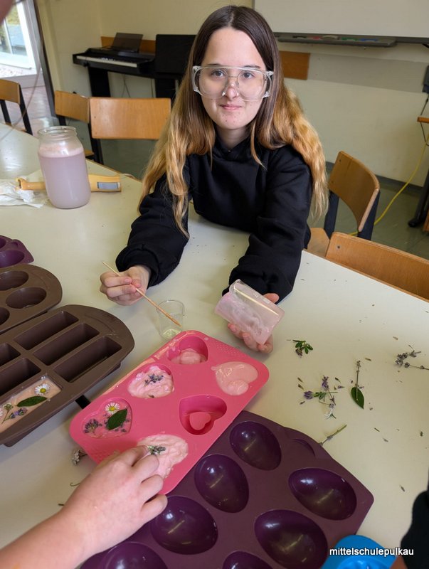 Im MINT Workshop mit Herrn Kraus produzierten die Kinder Seifen. Mit den richtigen Zutaten und Mixtur wurde fleißg gemischt und gerührt und die Masse wurde in die Förmchen gegossen. Das Ergebnis ist sehr nett geworden.