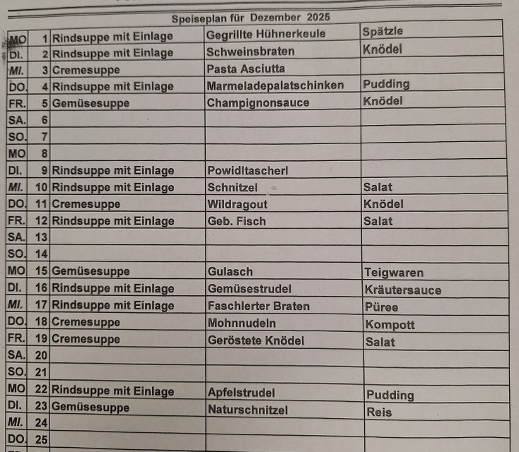 Wenn du Nachmittagsunterricht hast, gibt es die Möglichkeit in der Schule ein Mittagsmenü um € 4,40 zu essen. Bitte im Konferenzzimmer vor 8 Uhr in die Liste eintragen. Gekocht wird vom Gasthaus Kurz in Weitersfeld.
