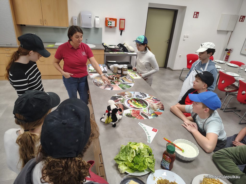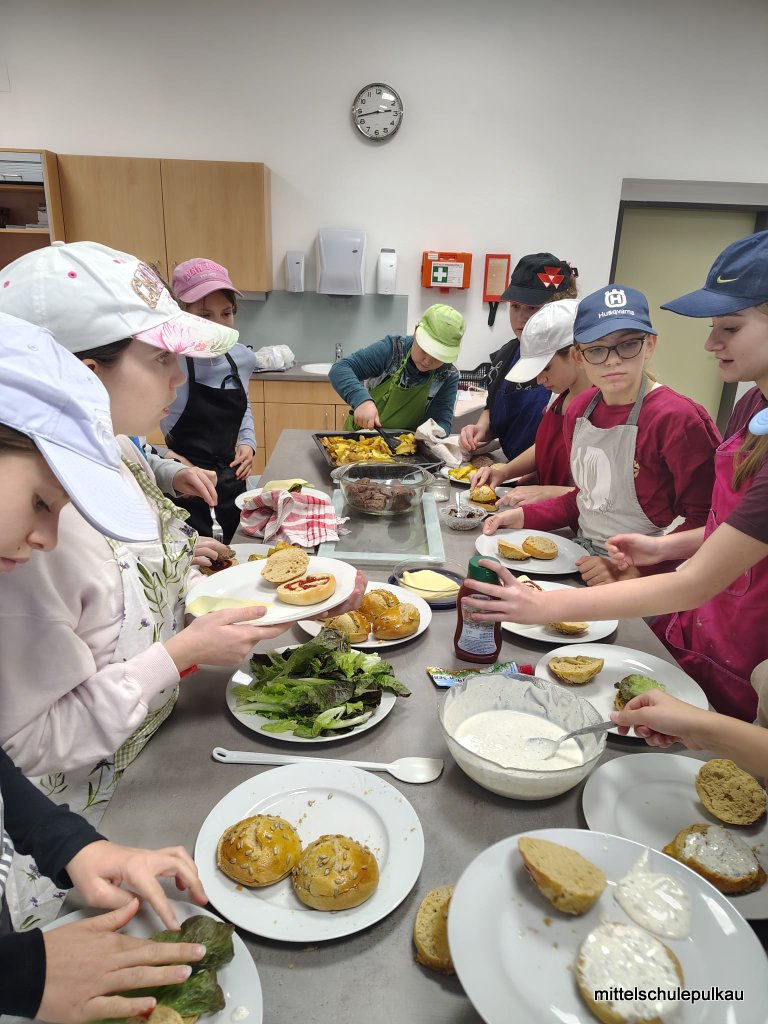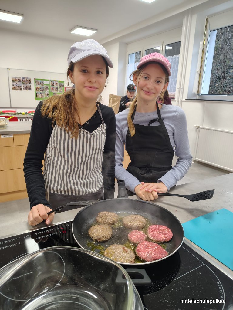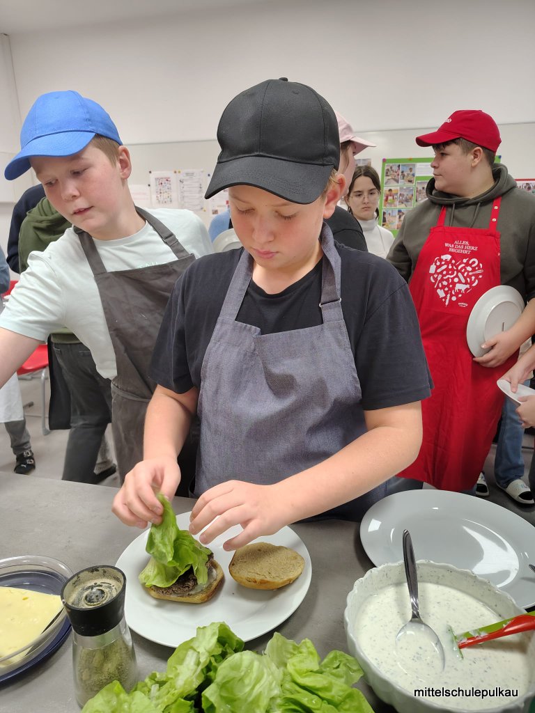 Schülerinnen und Schüler aus der HLT kochten mit Frau Widhalm mit unseren Kinder. Es gab Burger und Co. Die Speisen gelangen gut und haben allen geschmeckt. Vielen Dank an unsere Partnerschule für die gute Zusammenarbeit.