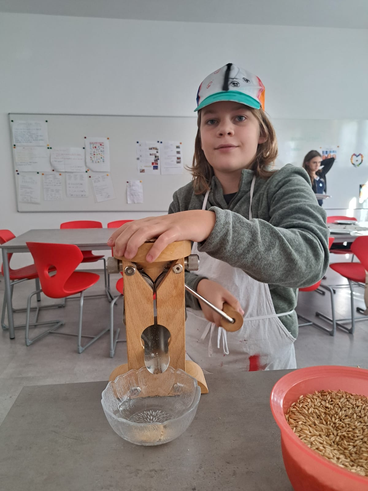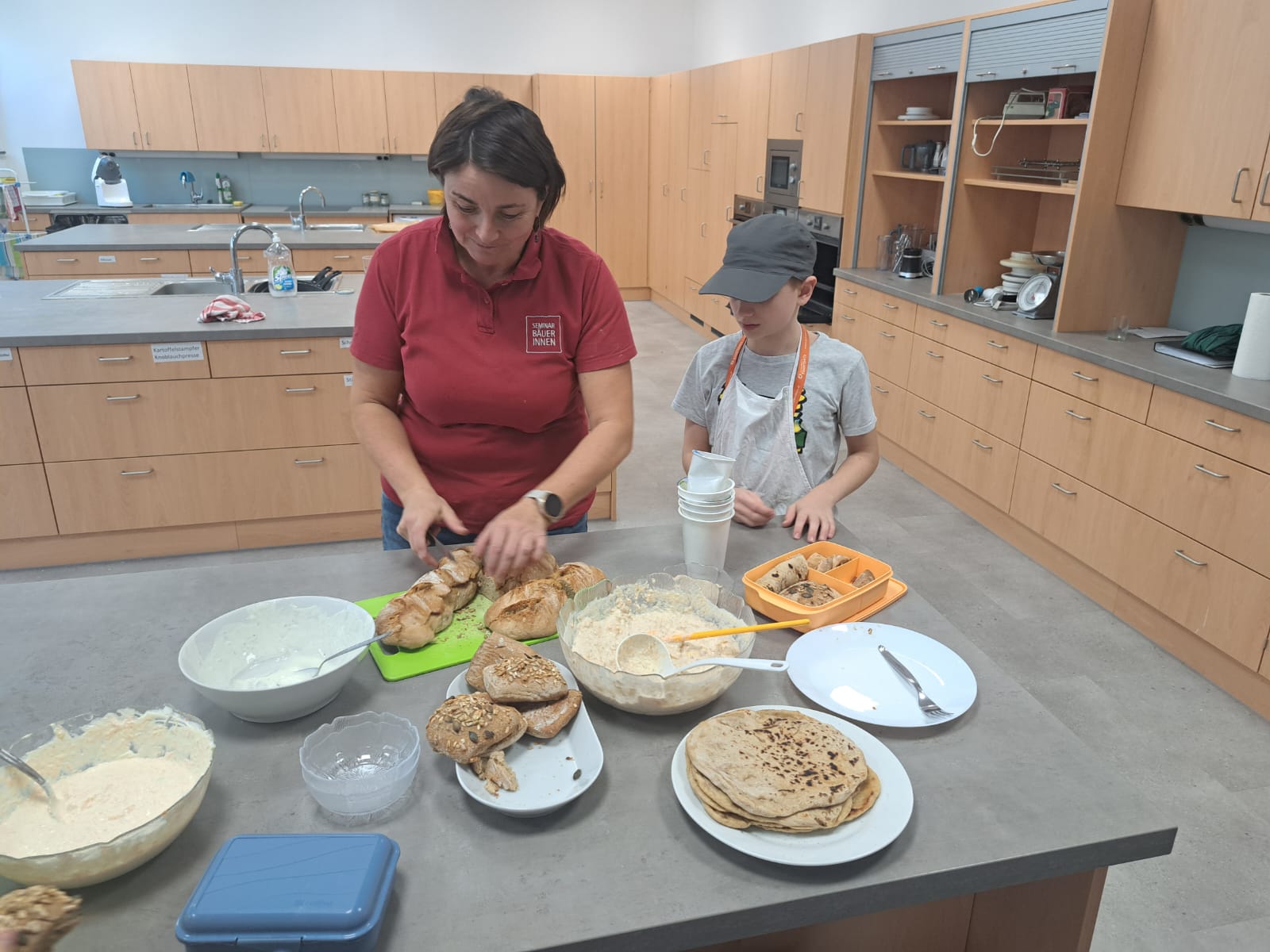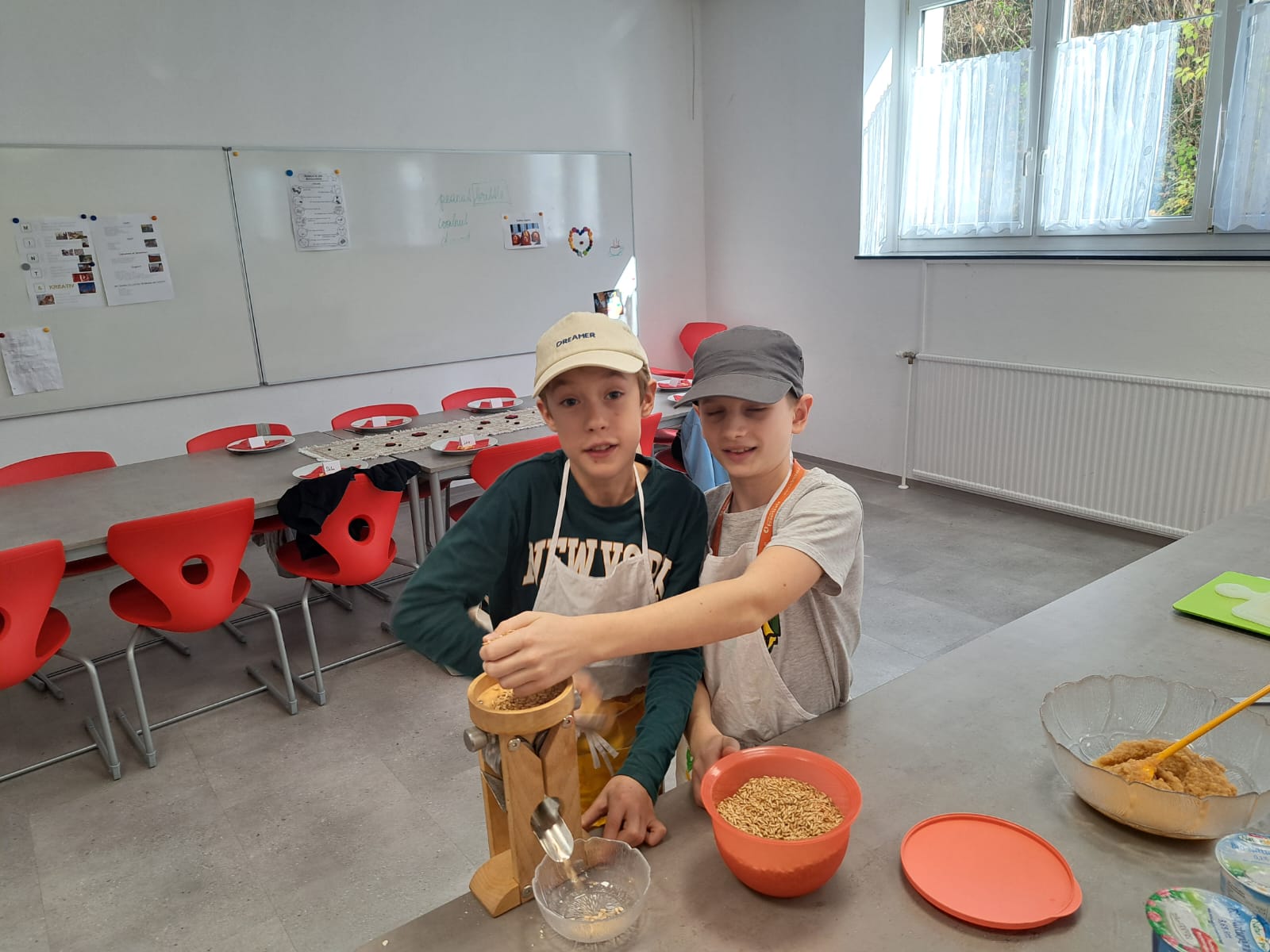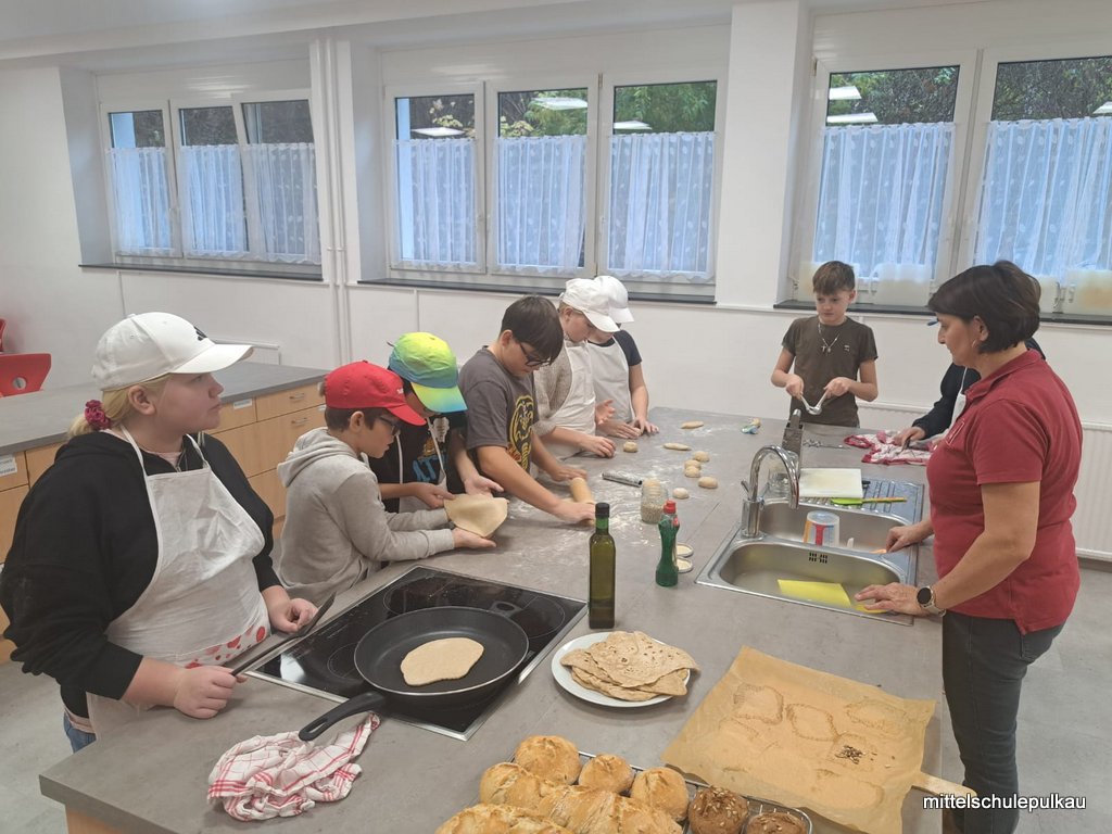 Wenn Frau Scharinger den Kochunterricht übernimmt, durftet es immer im ganzen Schulhaus nach frisch gebackenem Brot. Diesmal durften die Gruppe A und eine Woche später die Gruppe B der zweiten Klasse ihre Backkünste unter Beweis stellen. Goldbraune Fladen wurden in der Pfanne gebacken und die duftenden Wurzelbrote im Backofen. Dazu gab es einen Vitalaufstrich mit Karotten und Topfen und einen Kräuterdip. Die selbstgequetschten Haferflocken verwandelten die Kinder schließlich in einen nahrhaften Getreidebrei mit fein geraspelten Äpfeln - ein echtes Powergericht für die Gehirnzellen. Ganz ehrlich: So schmeckt Schule besser!
