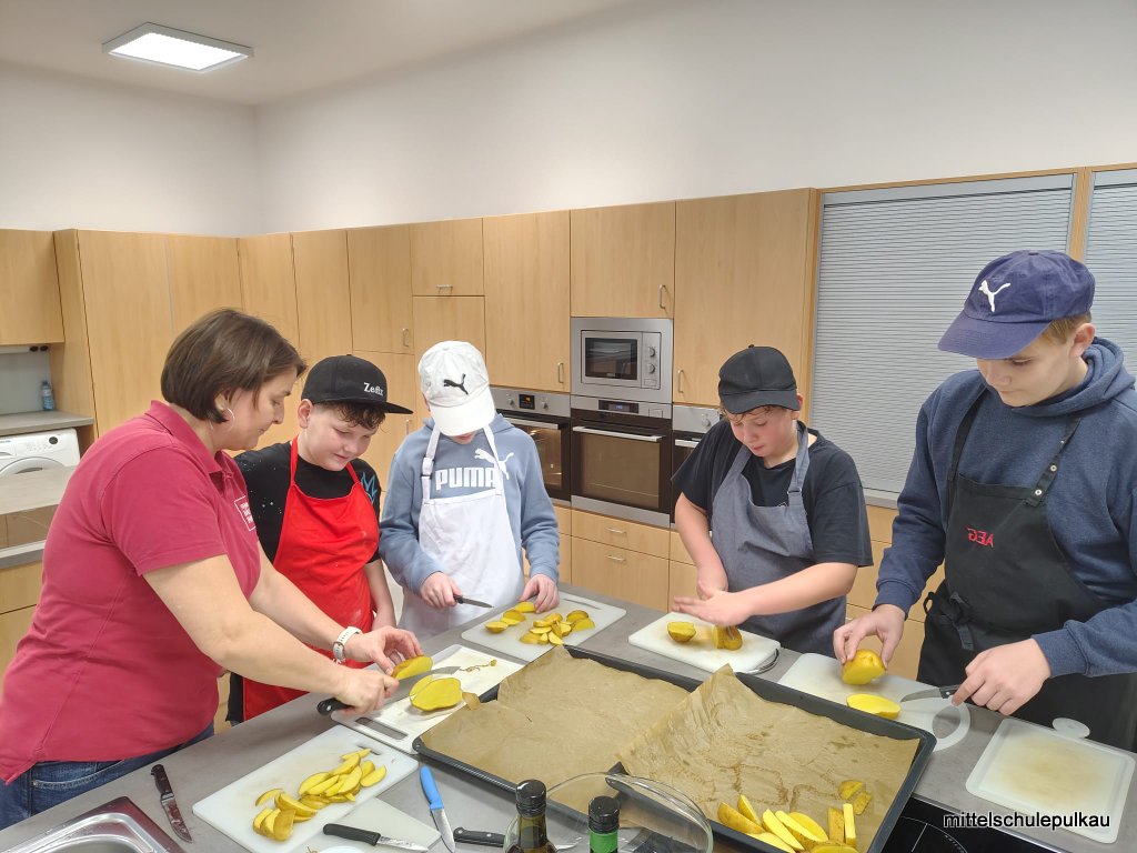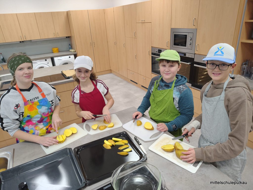 Für die 3. Klasse gab es Erdäpfelgulasch und Apfelstrudel. Für das Gulasch mussten viel Zwiebel und Erdäpfel klein geschnitten werden. Die 4 Apfelstrudellängen enthielten ebenfalls eine Menge an Äpfeln, die in kleine Stücke geschnitten wurden. Der Teig für die Mehlspeise wurde ebenfalls selbst hergestellt und geknetet. Die Ergebnisse sind wunderbar geworden!