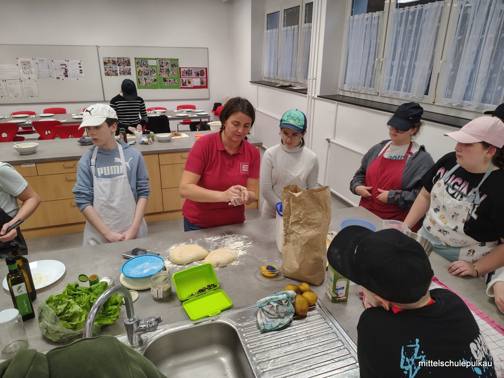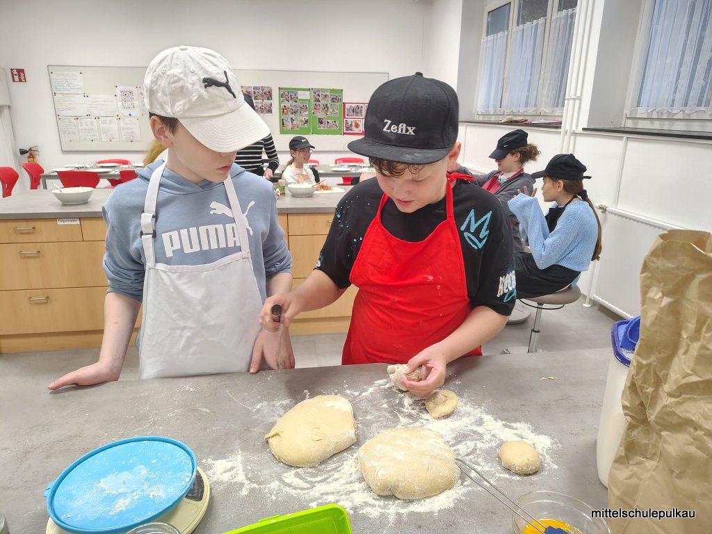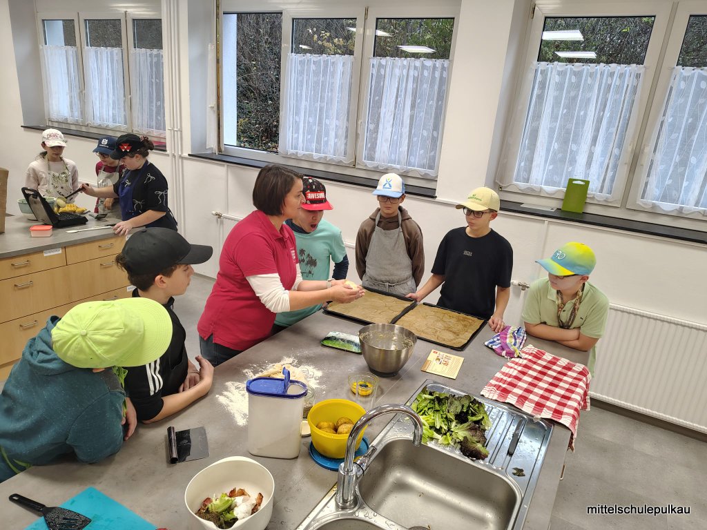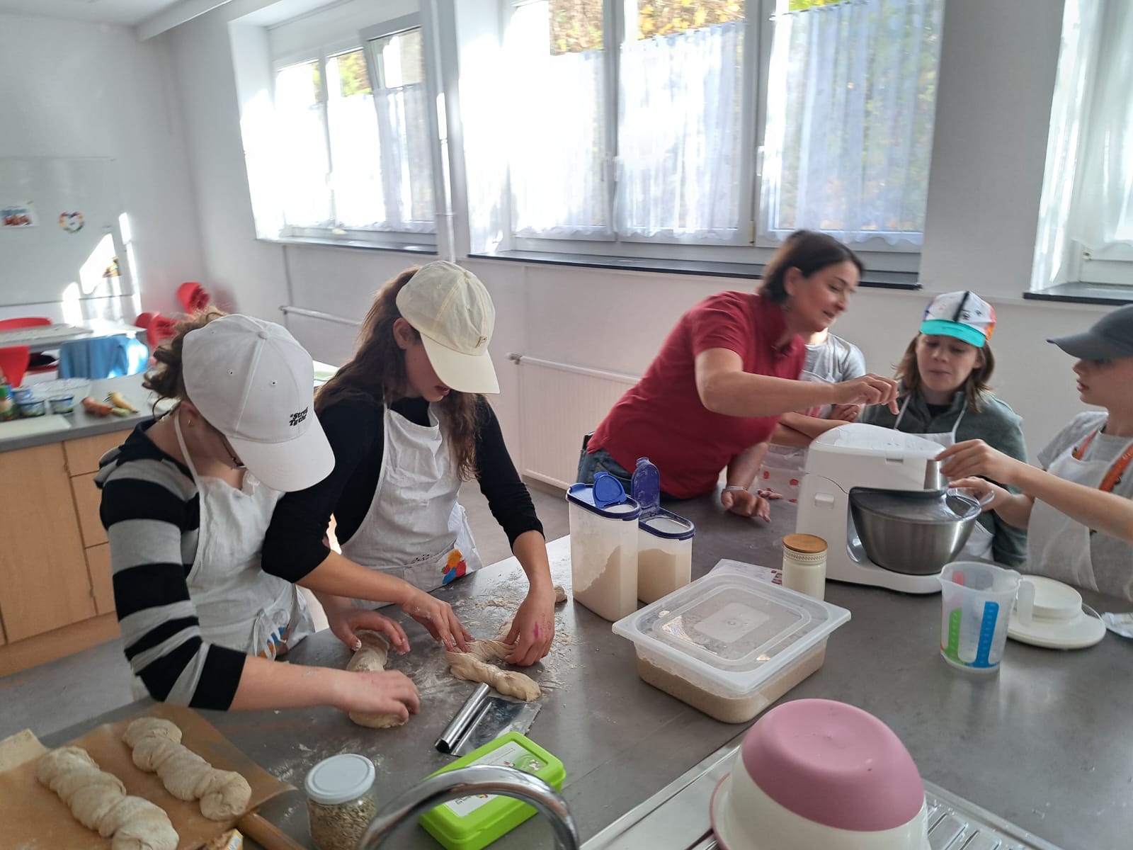 In den beiden zweiten Klassen zeigte Frau Scharinger den Schüelrinnen und Schülern wie man köstliches Brot und Gebäck recht schnell backen kann. Es duftete durch das ganze Schulhaus. Auch gesunde Palatschinken wurden gebacken.