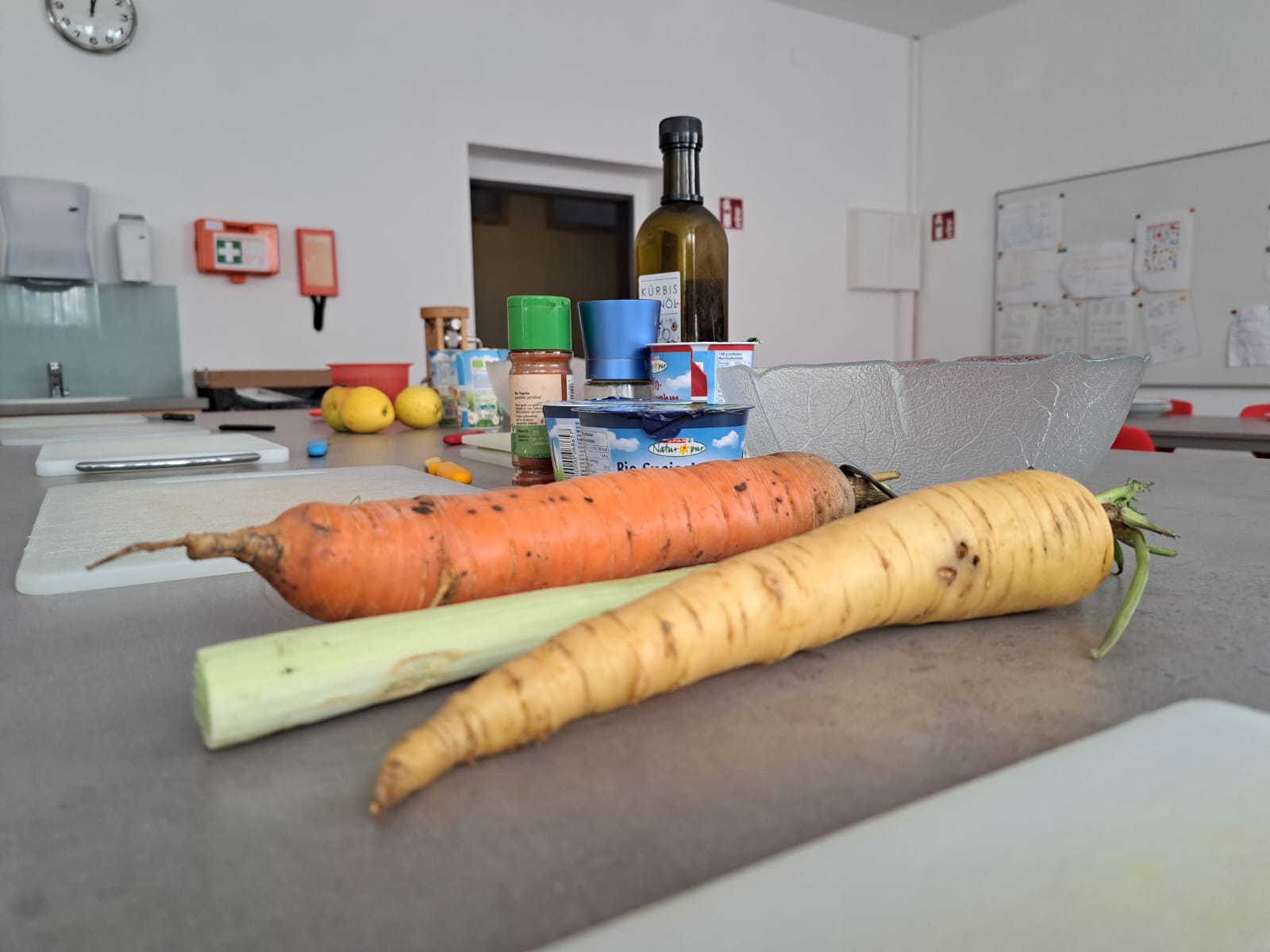 Das Menü der 6. Einheit lautet Kürbiscremesuppe, Gemüselaibchen mit Joghurtsauce und Eisbergsalat. Als Dessert wurde ein köstliches Tiramisu zubereitet. In der 7. Einheit bereiten die Kinder Nudelsuppe, Reisfleisch (auch eine vegetarische Variante) und Brandteigkrapferl mit Vanillecreme zu. Es hat jeweils sehr gut geschmeckt.