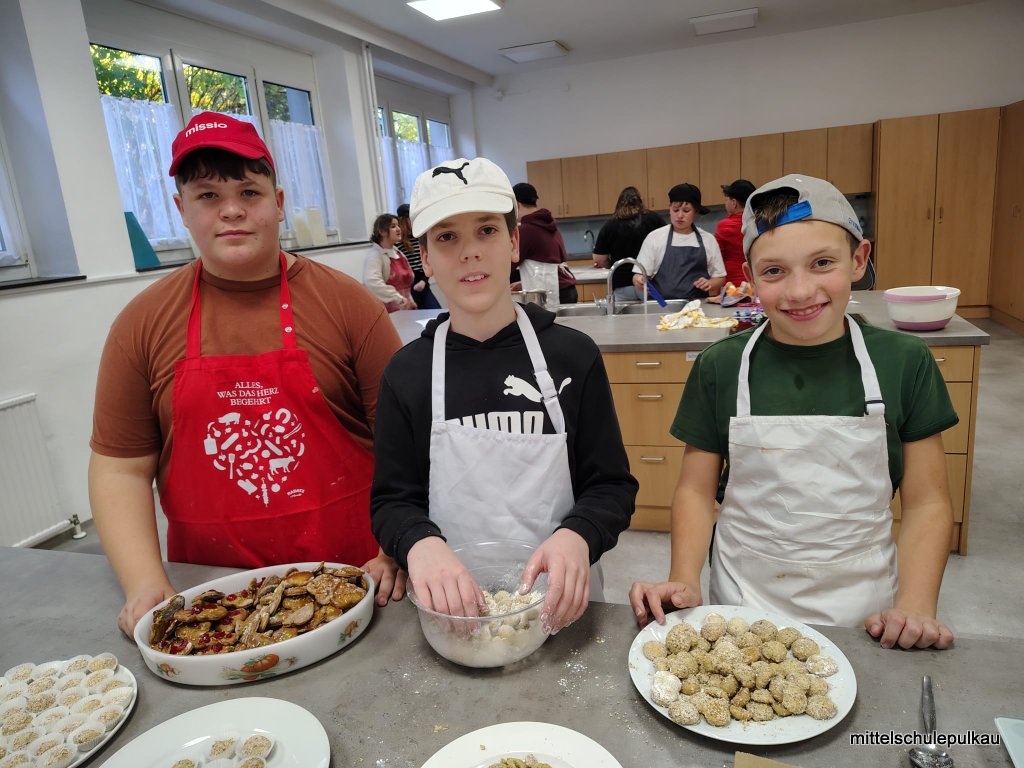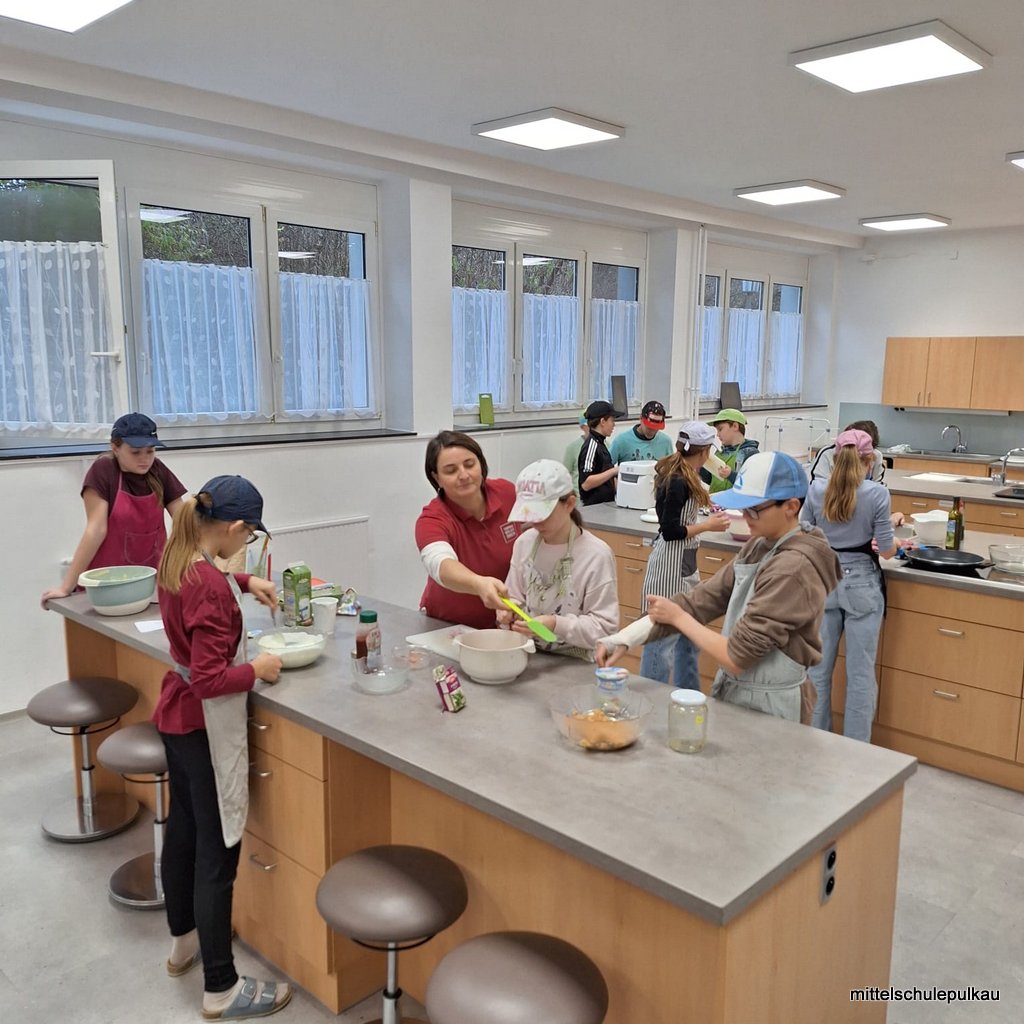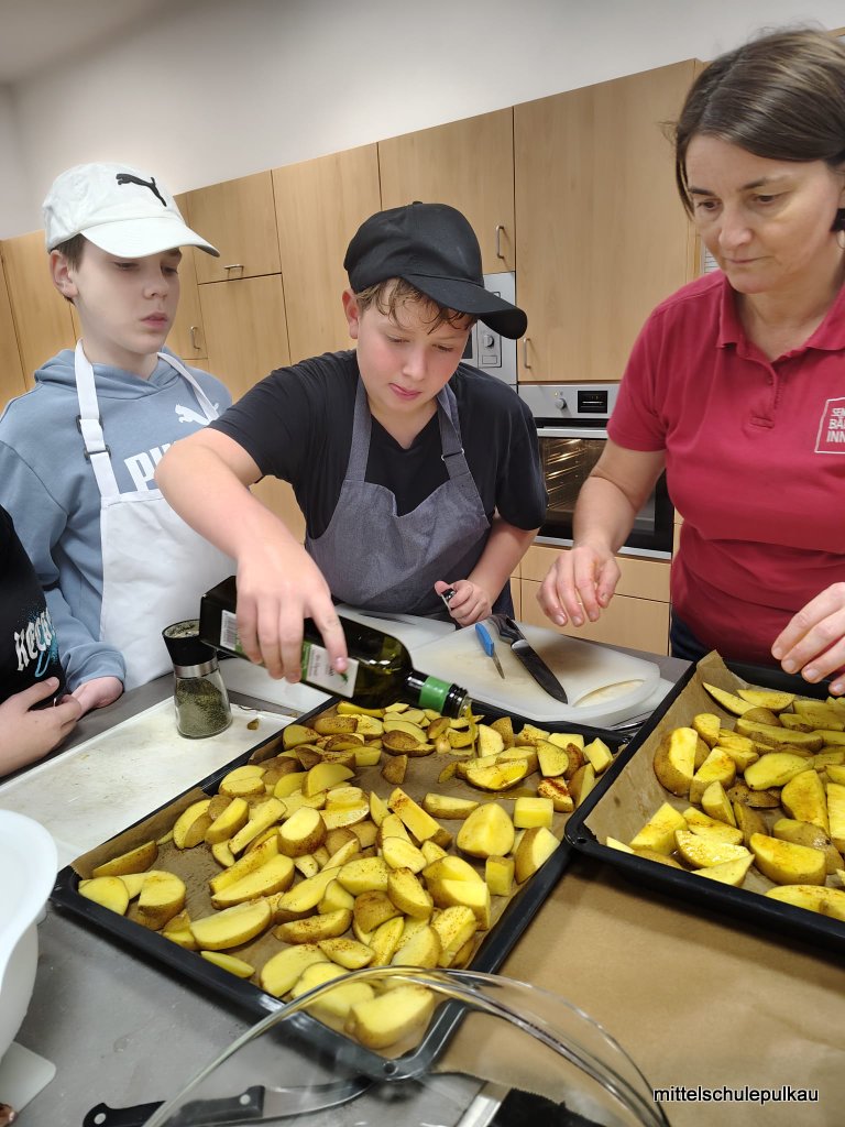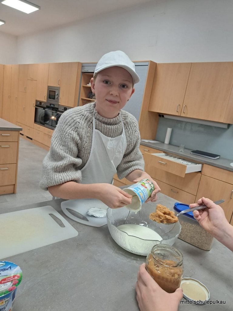 Die Schüler und Schülerinnen der 3. Klasse kochten iene Greißnockerlsuppe, sowie eine Erdbeer-Topfen-Butterkekscreme. Bereits vorbereitet war eine Lasagne, sie wurde in der Schule noch gekocht und genau besprochen, wie diese zubereitet wird. Es hat alles sehr gut geschmeckt.