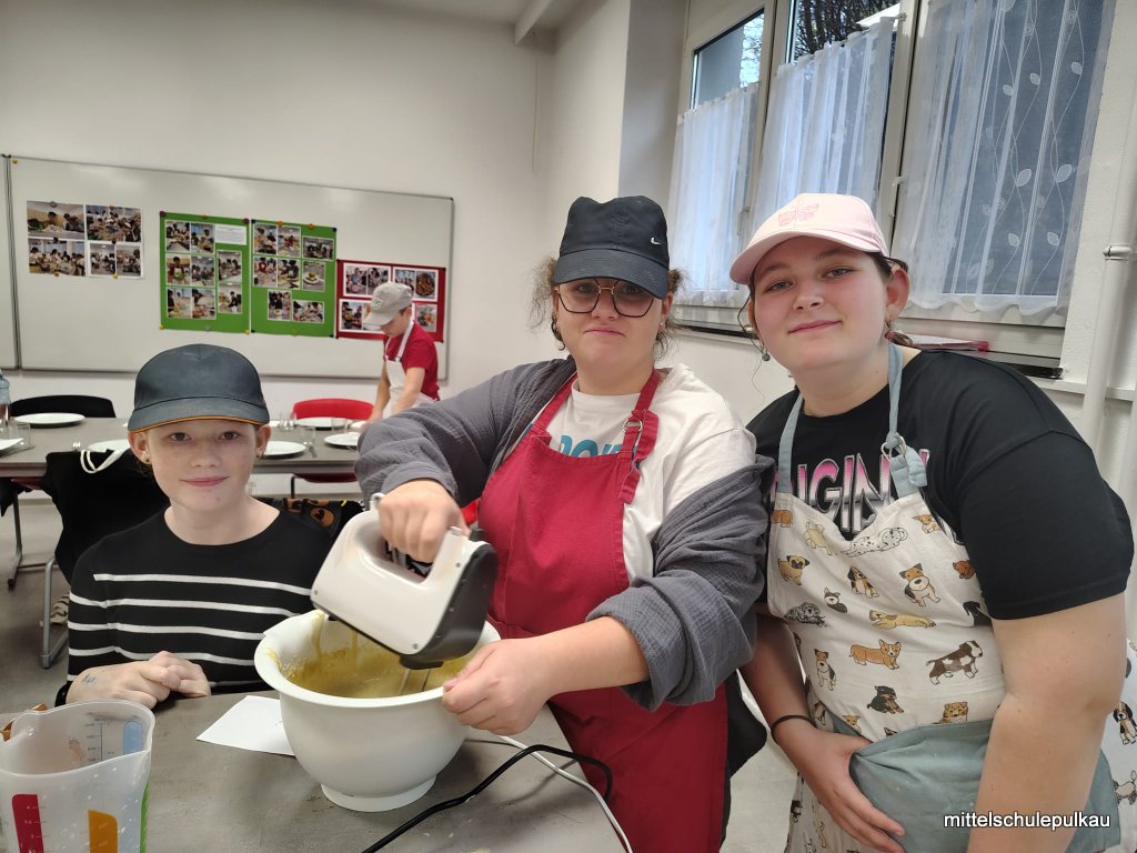 Die 3a und 3b bereiten ein köstliches Menü zu. Die Speisenfolge: Kürbiscremesuppe, Buchteln mit Vanillesauce und Rahmkuchen. Die Kinder waren eifrig bei der Sache und ließen sich die Speisen sehr gut schmecken.