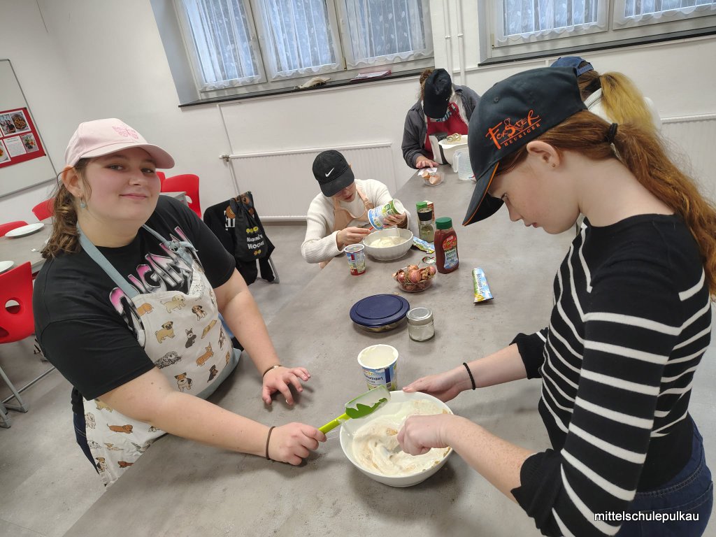 Es ist schon Tradition, dass in der ersten Kocheinheit Aufstriche gemacht werden, um ds Gemüseschneiden zu üben. Es gab einen Liptauer, einen Wurst-und Eiaufstrich. Dazu gab es Gemüsesnacks und Brot. Die Kinder haben fast alles aufgegessen.