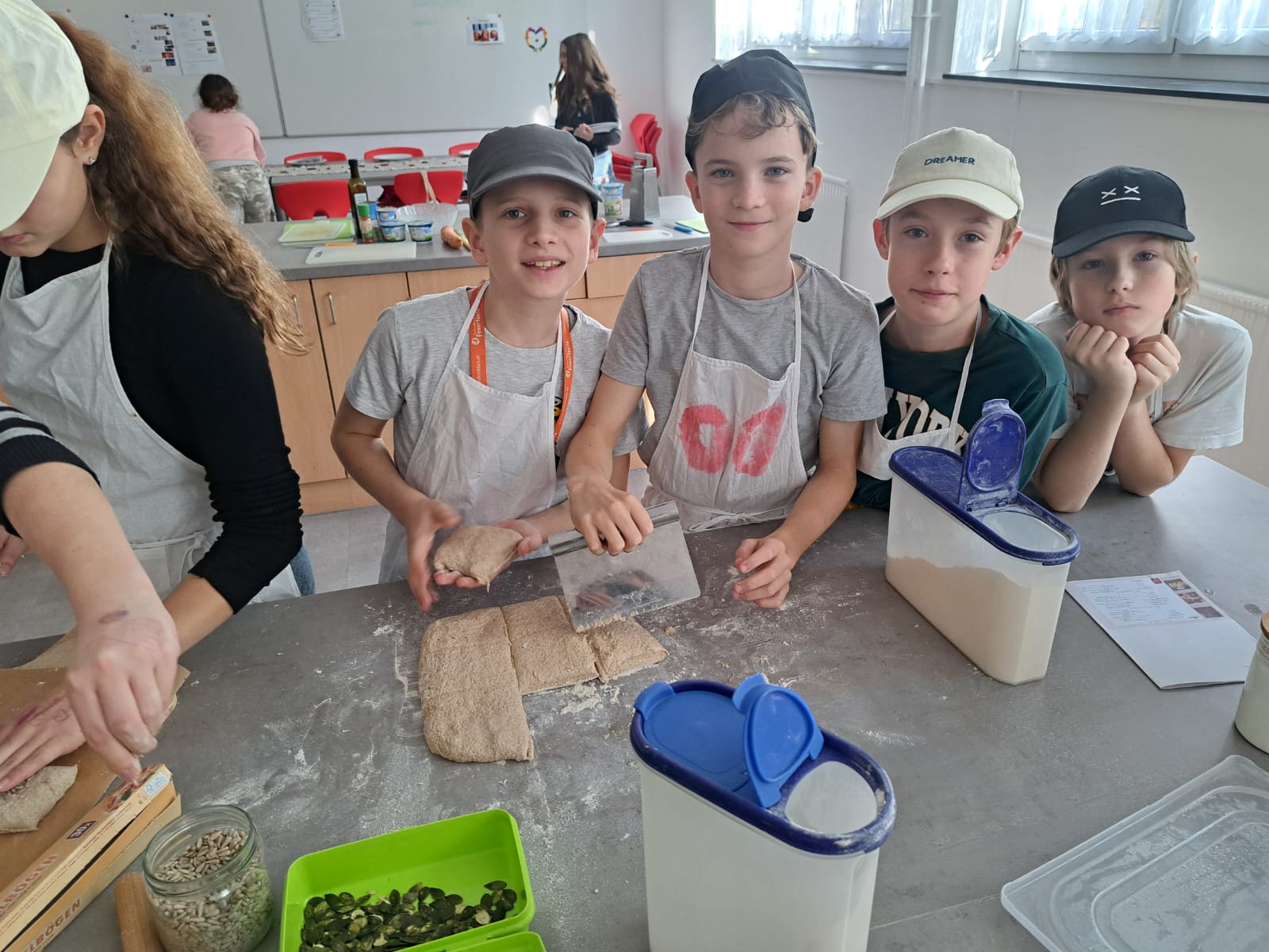 Ein gern gesehener Gast an unserer Schule ist Seminarbäuerin Christina Scharinger. Diesmal zeigte sie den Kindern der 2. Klasse den Weg des Korns zum Brot. Zubereitet wurden ein Wurzelbrot, Dreikornweckerl, ein Aufstrich, Joghurtsoße mit Feuerflecken, sowie Obst mit Haferflocken und Joghurt. Es hat wunderbar im Haus gerochen und die Kinder ließen es sich schmecken. Wundebar auch der selbstgebastelte Tischschmuck.