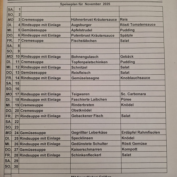 Wenn du Nachmittagsunterricht hast, gibt es die Möglichkeit in der Schule ein Mittagsmenü um € 4,40 zu essen. Bitte im Konferenzzimmer vor 8 Uhr in die Liste eintragen. Gekocht wird vom Gasthaus Kurz in Weitersfeld.