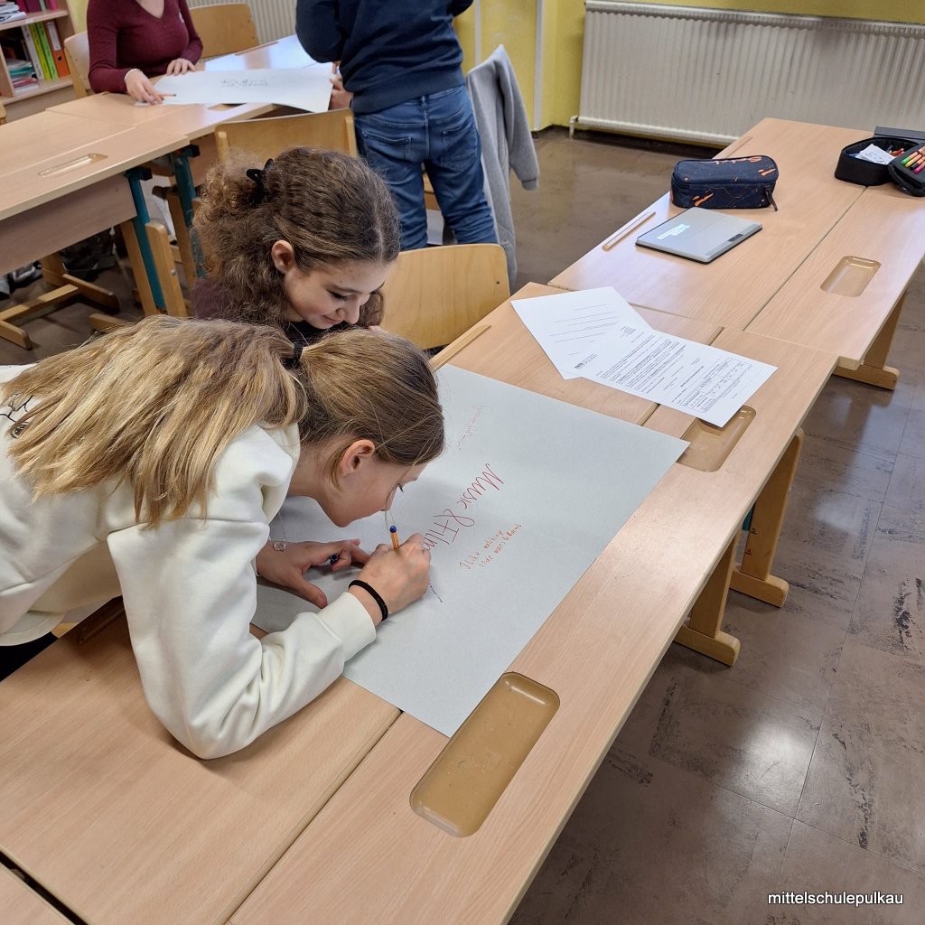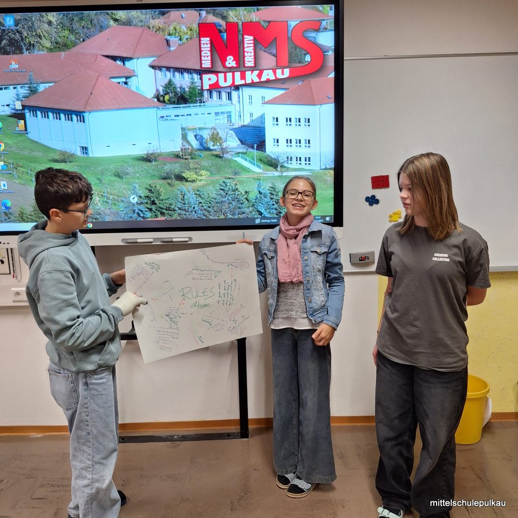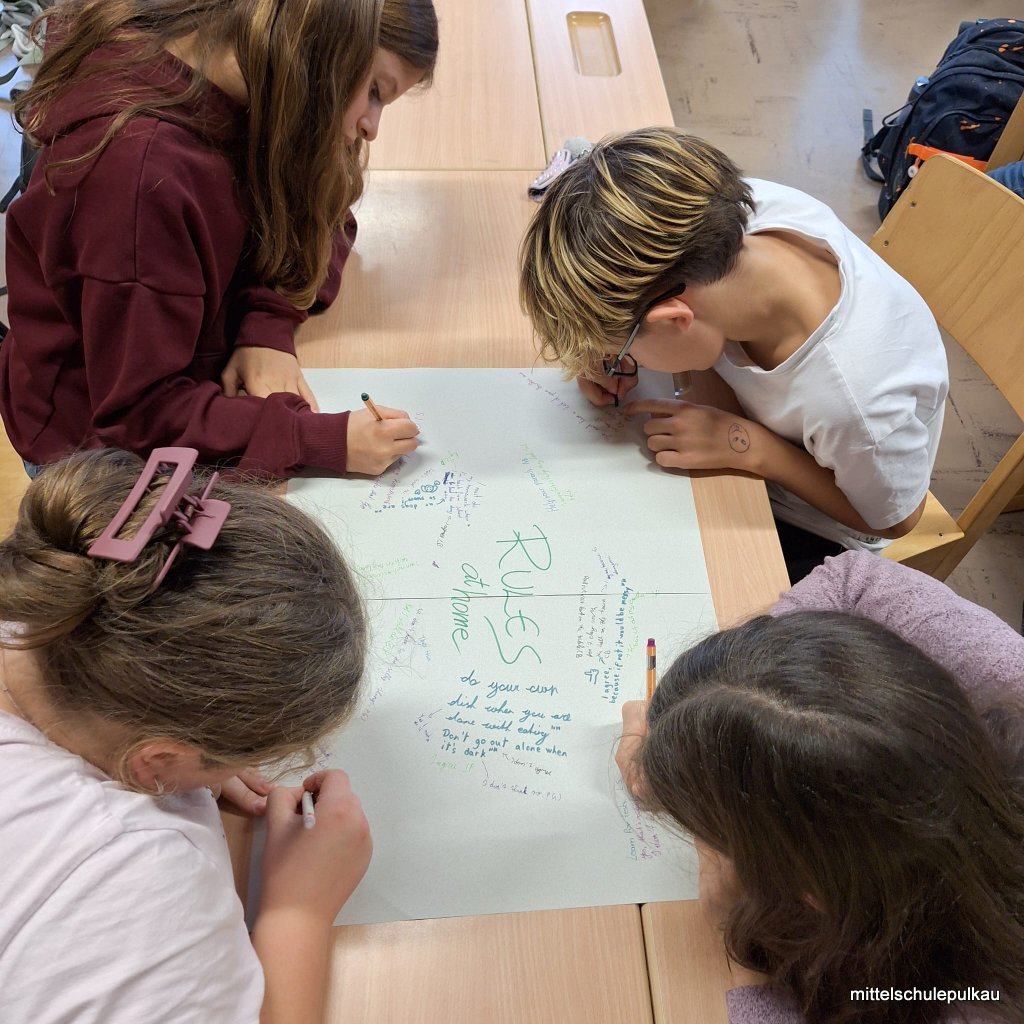 Zunächst wurden Vokabeln zum Kommentieren geübt. Danach gab es vier Poster mit unterschiedlichen Themen, die zu den aktuellen Units passen. „Rules at home”, „Rules at school”, „Activities” und „Music and Films”. Die Kinder rotierten um die Poster, schrieben Sätze dazu und durften die anderen Sätze kommentieren – und das in Stille. Sie haben wirklich gut gearbeitet. Zum Abschluss wurden die Poster kurz präsentiert. Gut gemacht.