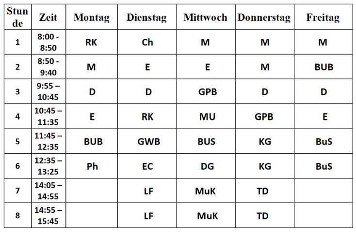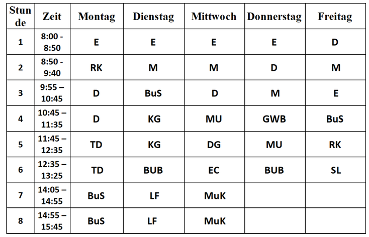 Erziehung) M … Mathematik MuK … Mint und Kreativ MUS … Musik RK … Religion SL … Soziales